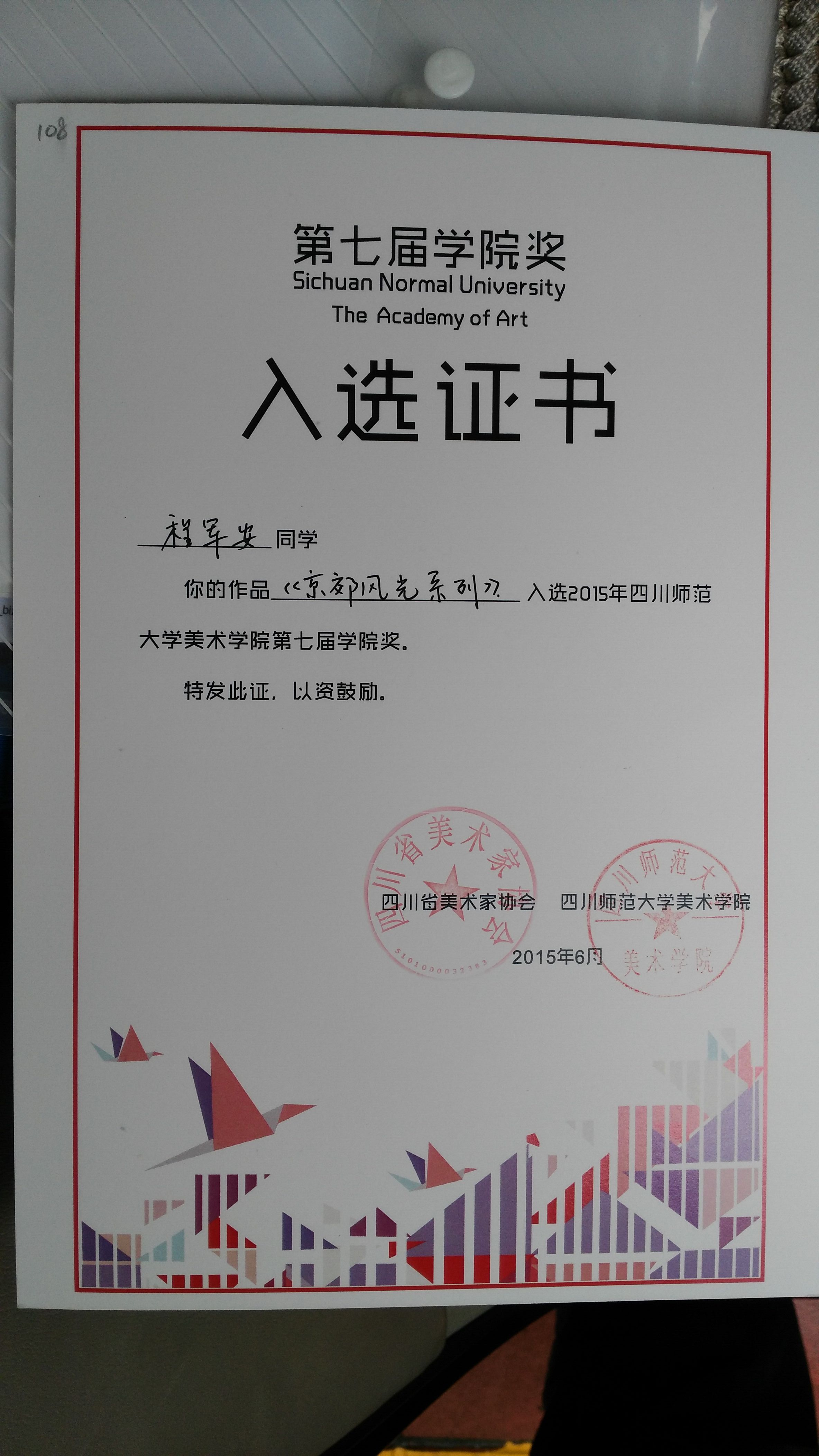 热烈祝贺我校美术教师程军安的作品《京郊风光系列》入选2015年四川师范大学美术学院第七届学院奖。四川师范大学美术学院“学院奖”是由四川省美术家协会和四川师范大学美术学院共同主办的一项美术展览评比活动,旨在展示学院教学成果,促进各高校间的交流,促进学院教育教学水平提升,提高教学质量。据悉,本届学院奖共收到来自四川大学、西南交大、西南民大等省内高校推荐的作品六百余件,经过初评、复评,展出作品约百余件。
