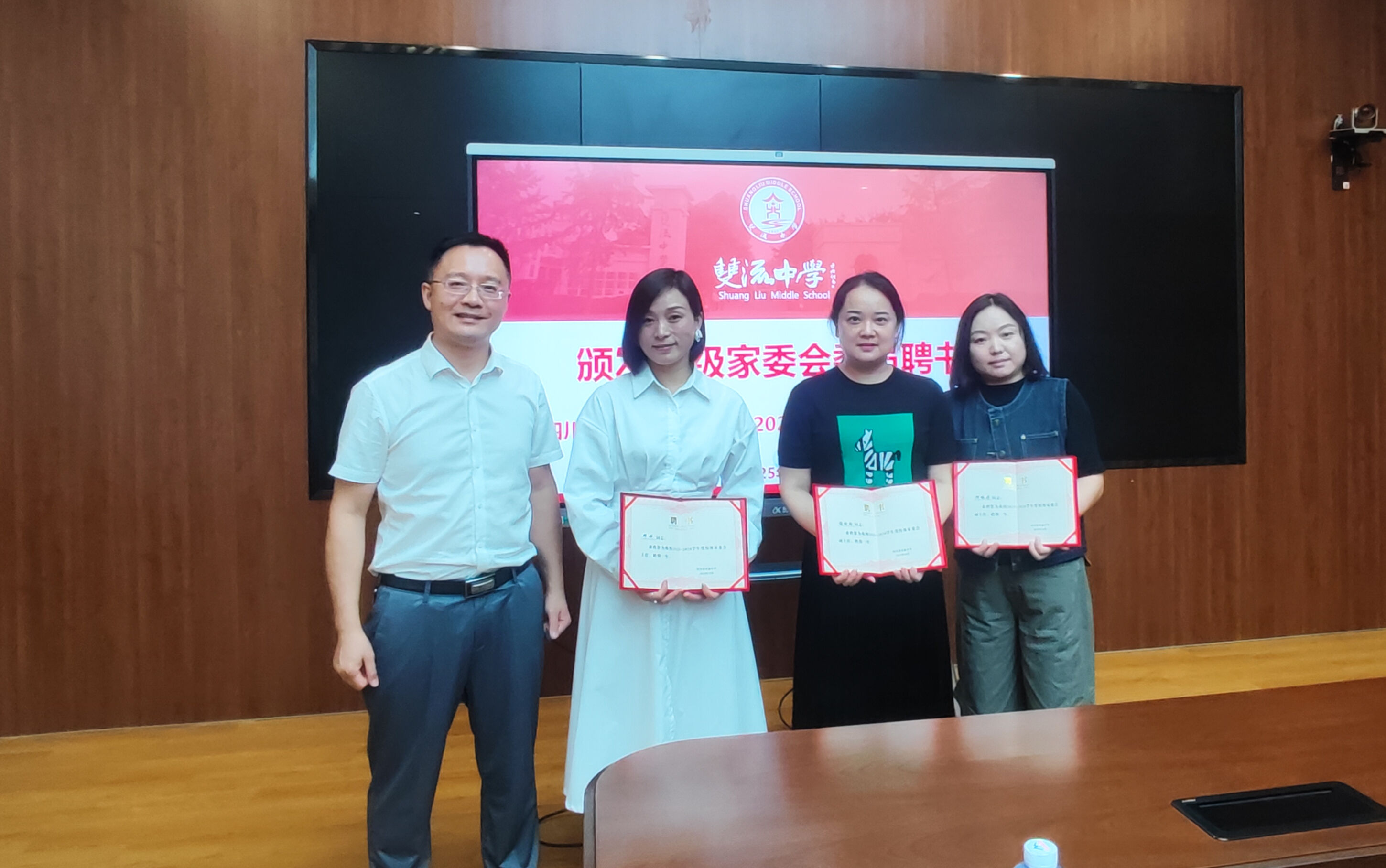 随后,何健主任庄重宣读《四川省双流中学 2025-2026 学年校级家委会成员名单》。家委会成员涵盖初一至高三各年级,职业背景多元,兼顾代表性与广泛性。最受瞩目的聘书颁发环节紧随其后。杜江涛副校长手持鲜红聘书,双手递出聘书并亲切握手、合影。家委会成员们接过聘书时动情表示:“这份聘书不仅是荣誉,更是沉甸甸的责任。我们定不辜负学校信任与家长重托,认真履职。” 现场掌声此起彼伏,满含对家委会工作的期待与祝福。
