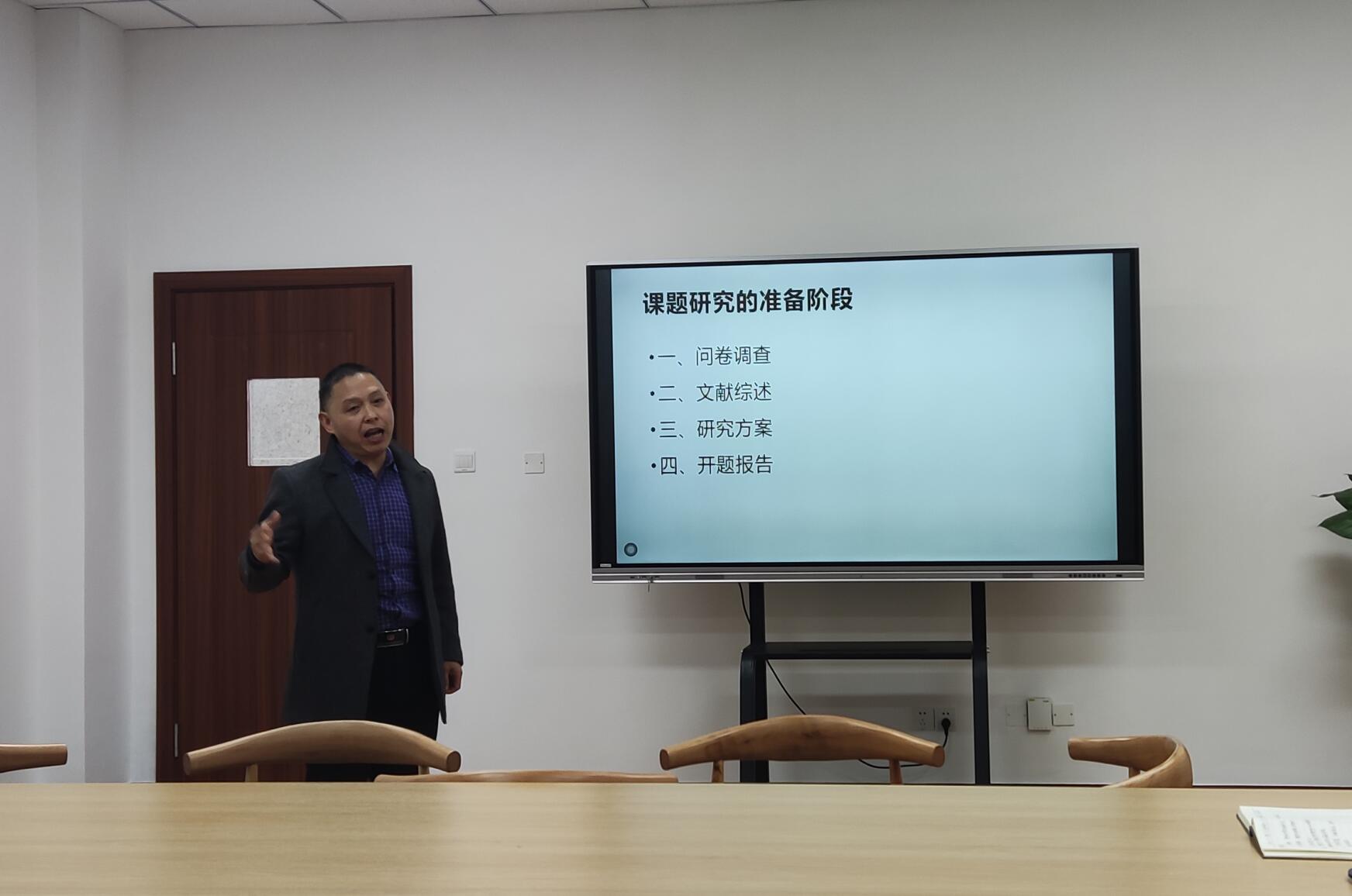 紧接着,陈老师着重介绍了课题研究的流程。陈老师指出,课题研究分为准备、实施、结题、推广和申奖四个阶段。作为一名资深的科研工作者,陈老师详细地向工作室成员介绍了课题研究各个阶段需要展开的工作流程:从调查问卷的设置到文献综述的撰写;从研究方案的确定到开题报告的撰写;从理论假设到逻辑推演;从实践检验再到成果提炼;从工作报告、检测报告、研究报告的撰写到支撑材料的呈现;从校内外的推广到课题申奖……每一个阶段的具体流程,陈老师都进行了具体入微的指导。名师引领,助力成长,陈老师的发言,不仅帮助工作室成员厘清了对课题研究重要性及课题流程的认识,更让大家有效地克服了畏难情绪,坚定了从事教育科研、攻坚克难的信心和决心。