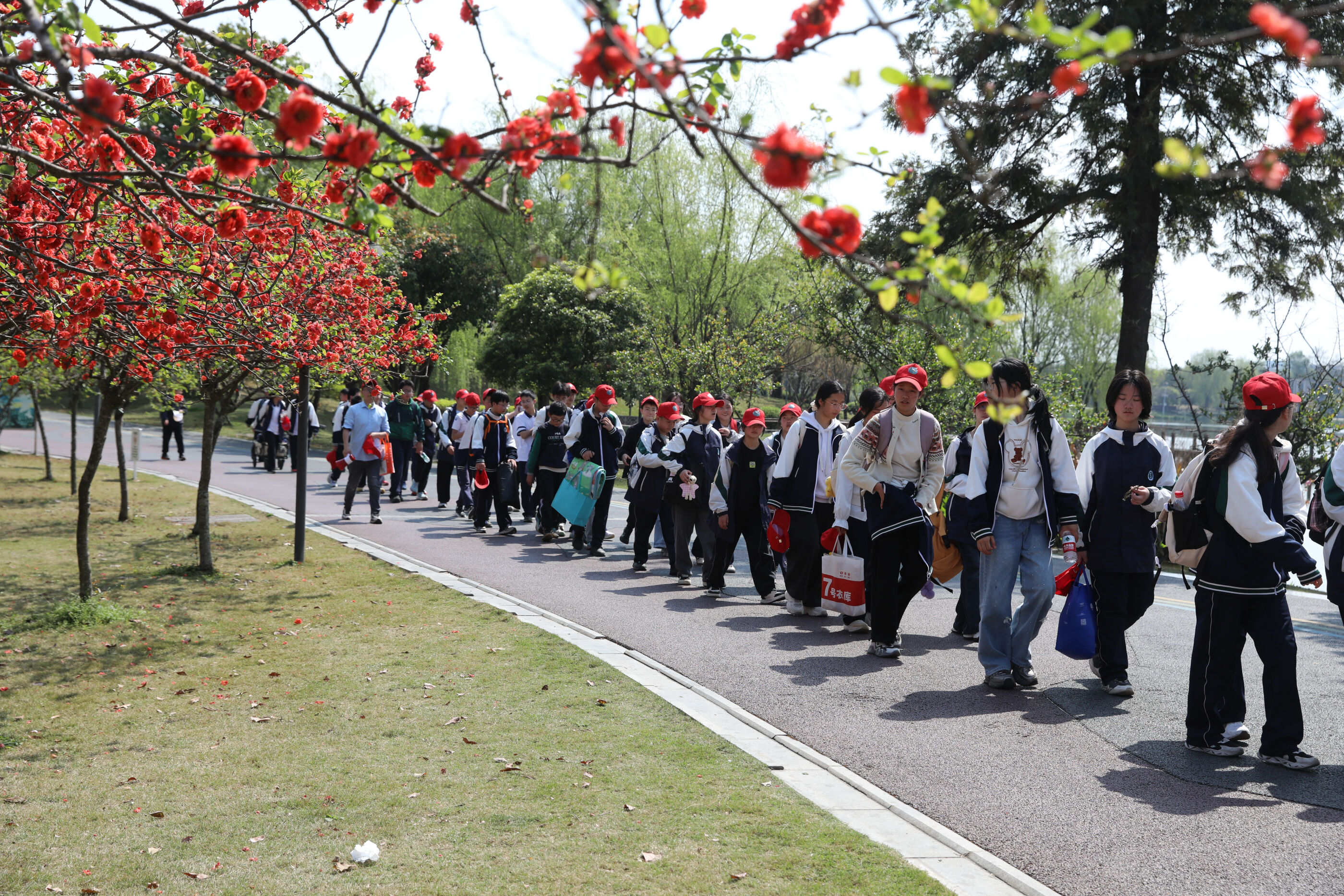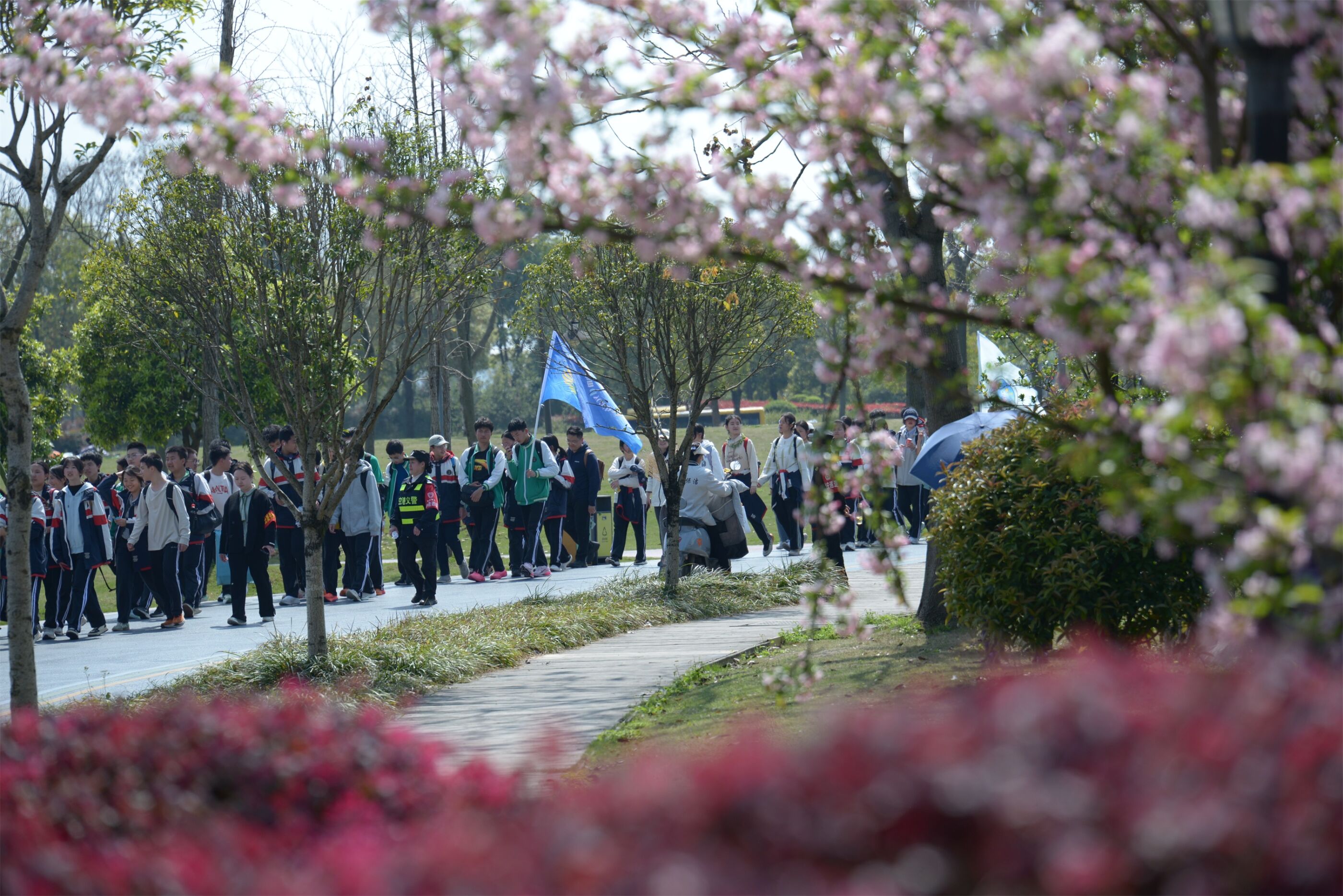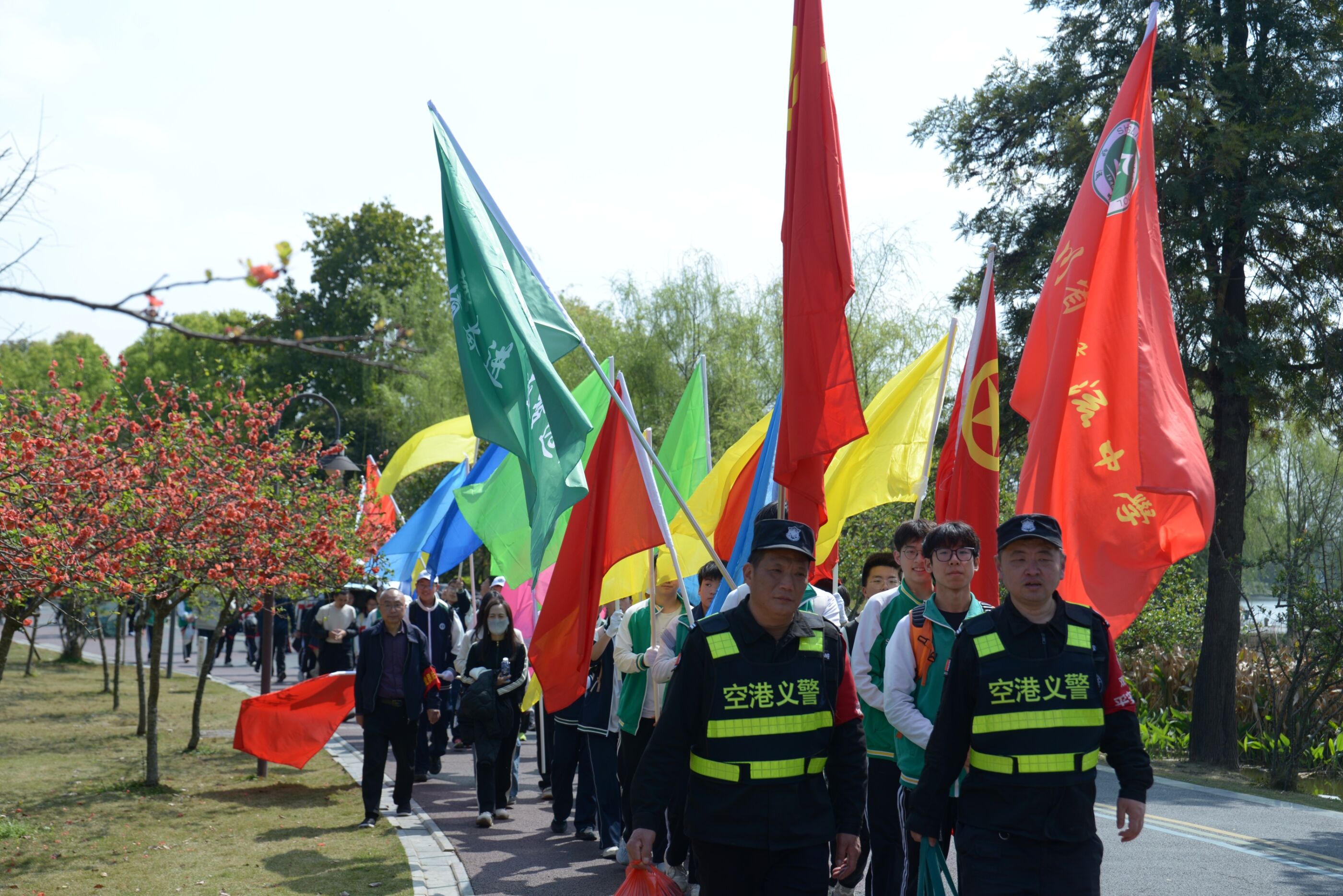 队伍行进在春日道路上