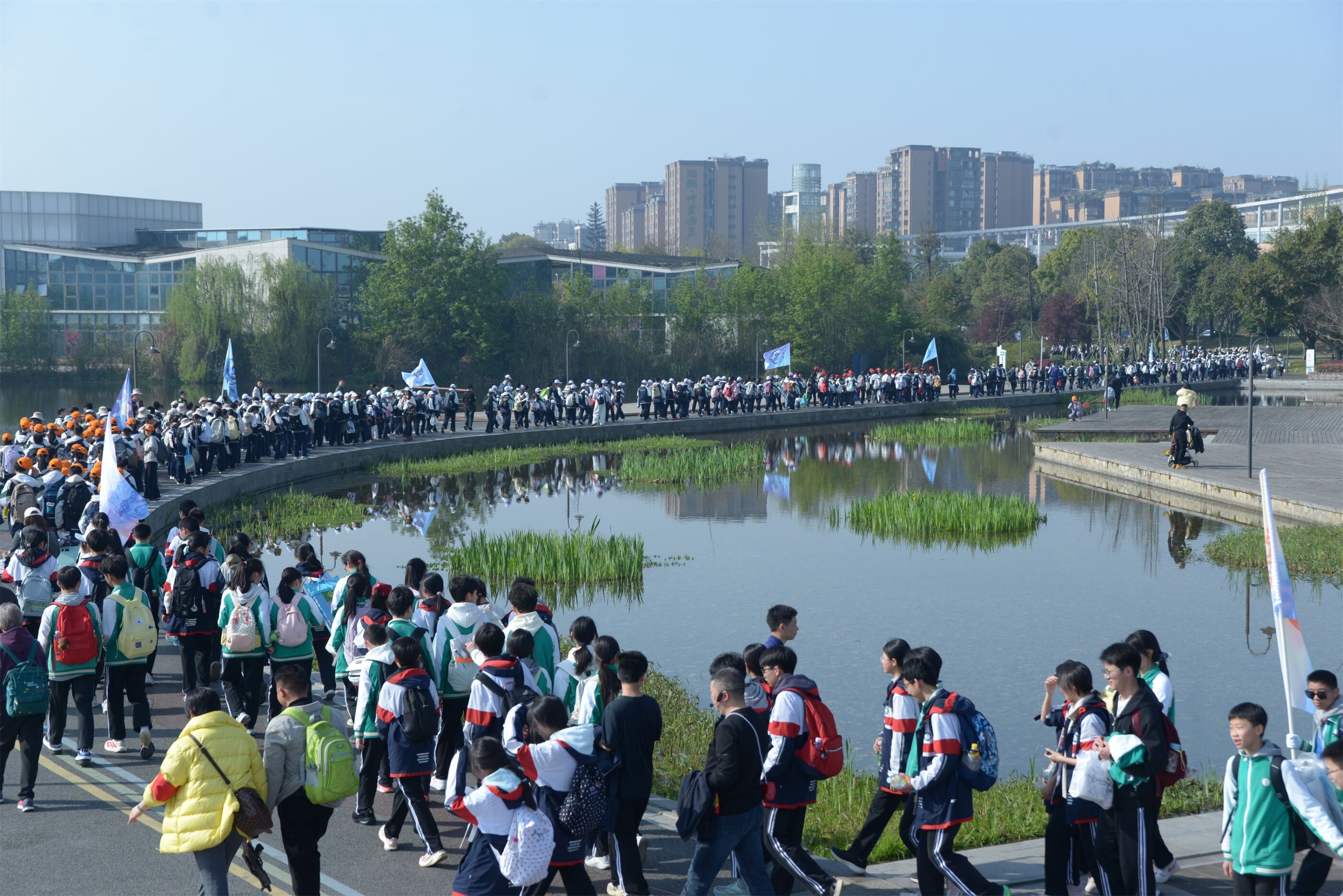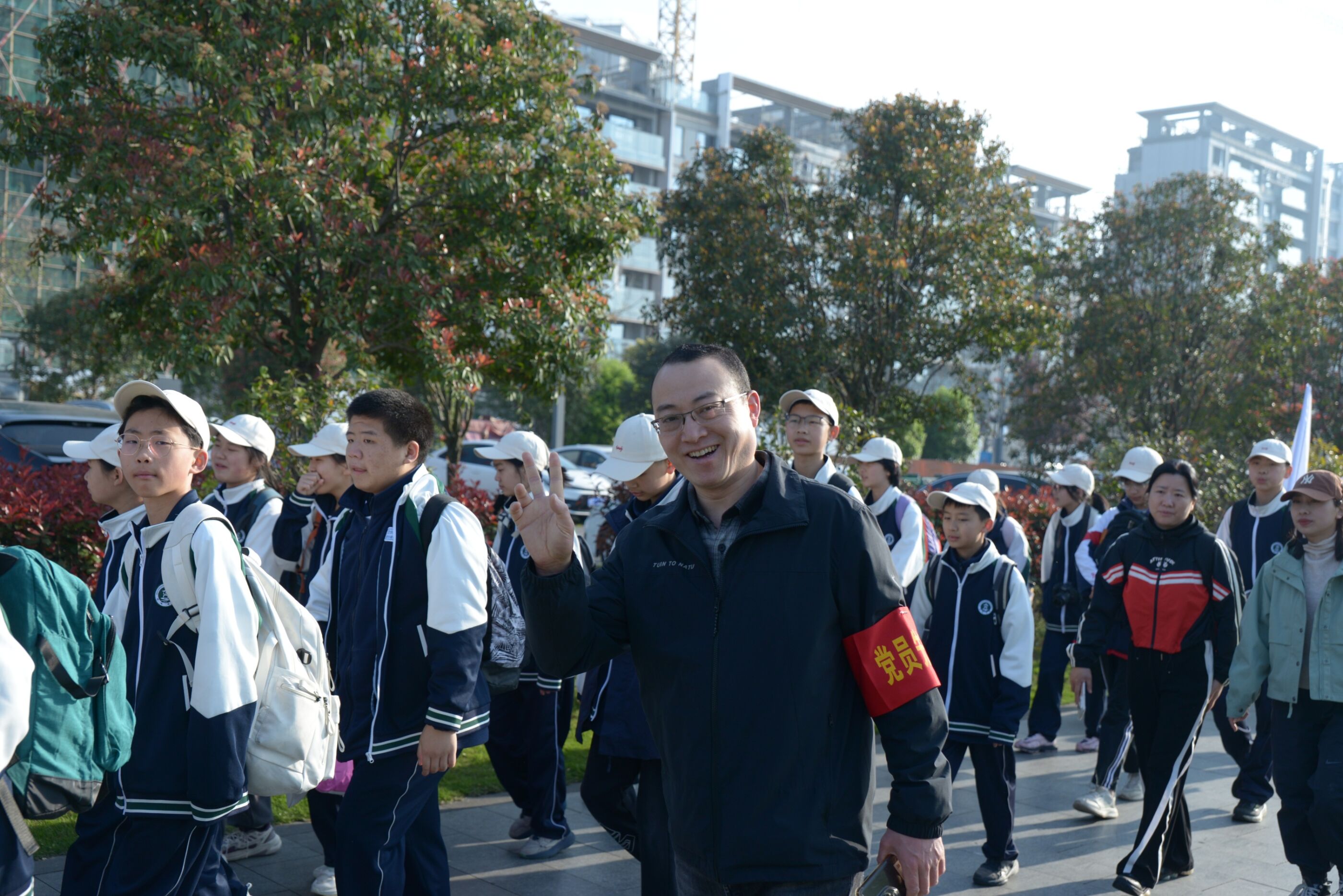 2026年3月20日上午,双流中学初中部举行远足研学实践活动。(图为 双流中学党委书记黄超领队出发)