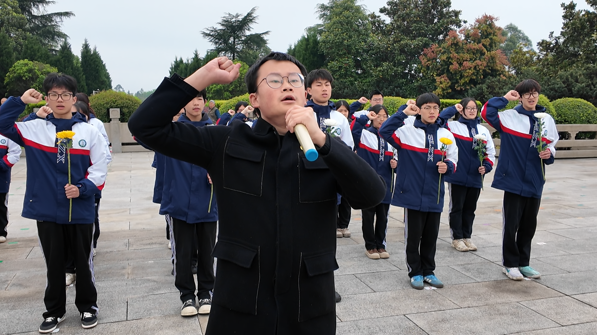 图8钟兴城同学在纪念碑下朗诵传承先烈遗志,勇担时代使命。在团委副书记胡峻闻老师的带领下,全体师生高举右拳,庄严宣誓。铿锵有力的誓言在陵园上空回荡,字字句句皆是对先烈的郑重承诺,彰显着双流中学师生坚定的报国志向与新时代青年的责任担当。