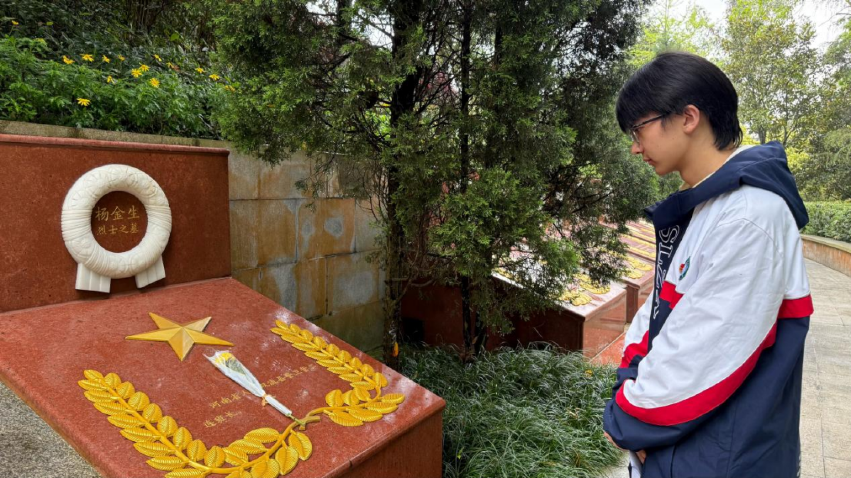图7师生们在纪念碑前全体默哀英雄从未远去,精神代代相传。高二14班的钟兴城同学代表全体师生深情朗诵《致先烈的一封信》。真挚的文字、饱满的情感,诉说着新时代青年对英烈的敬仰,更传递出传承红色薪火、勇担时代重任的坚定决心。