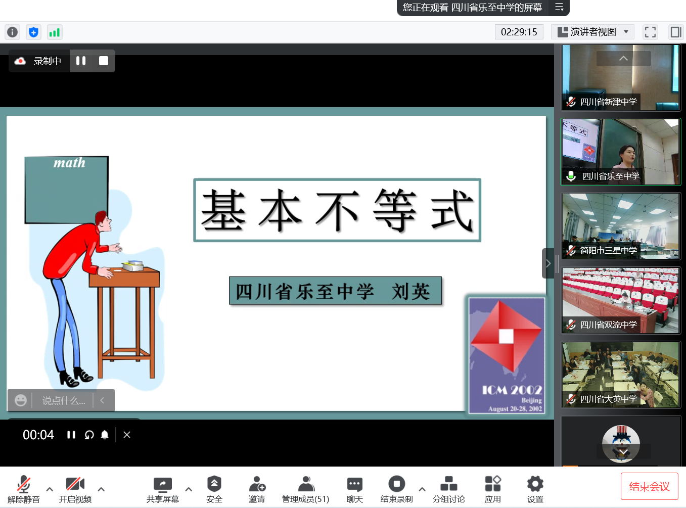 149区域教育联盟数学学科节2022年5月16日下午,由四川省双流中学承办的149跨区域教育联盟数学学科节成功举办。本次活动由双流中学数学组以及曹军才名师工作室策划举办,主题为“基于深度学习的数学教学说课比赛”,利用腾讯视频会议线上与线下结合,主会场与分会场同步开展。会议由四川省特级教师、双流中学数学学科教研组长曹军才主持。