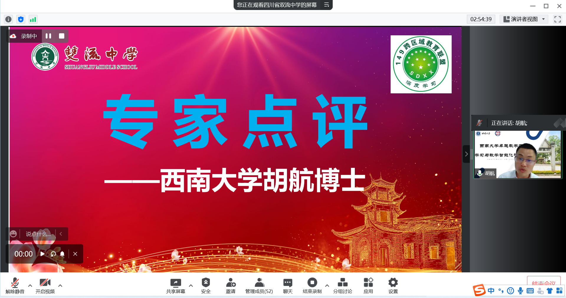 曹军才老师主持活动会议第一项议程是开幕式,主持人简要介绍了本次活动的目的和几项议程,并隆重介绍出席本次活动的的各位专家,他们是西南大学卓越(智能)教学中心主任,教育学博士,博士生导师,教育部考试中心专家(新高考方案组)胡航教授;四川外国语大学语言智能学院教授,Oracle数据库认证专家,西南大学深度学习团队核心成员杜爽博士;西南大学全国“深度学习与智能教育”联盟科研助理马子潇女士;四川省教育科学研究院中学数学教研员,普通高中教育研究所所长,中小学正高级教师,四川省特级教师吴中林老师。