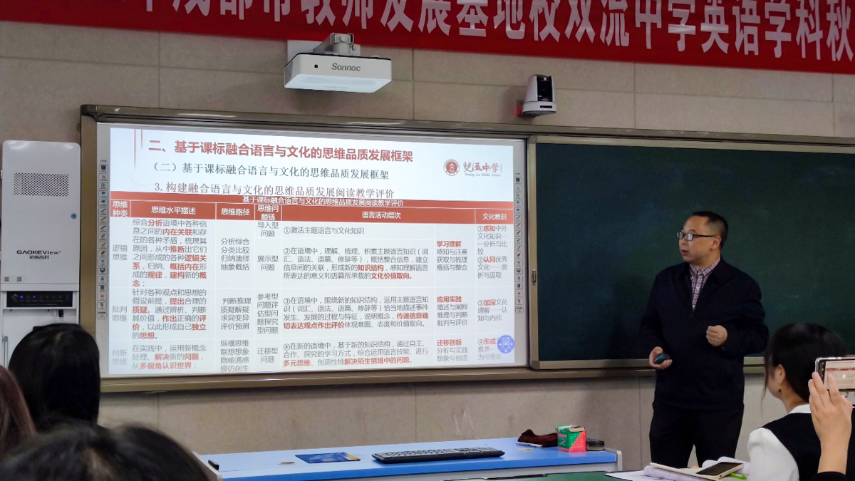 四川省双流中学英语教研组组长余晓冬老师以《基于课标融合语言文化的高中英语思维品质发展框架》为题进行了主题讲座。余老师的讲座分为三个主要部分:一,思维品质的内涵界定;二,基于课标融合语言与文化的思维品质发展框架;三,基于发展框架的案例分析。
