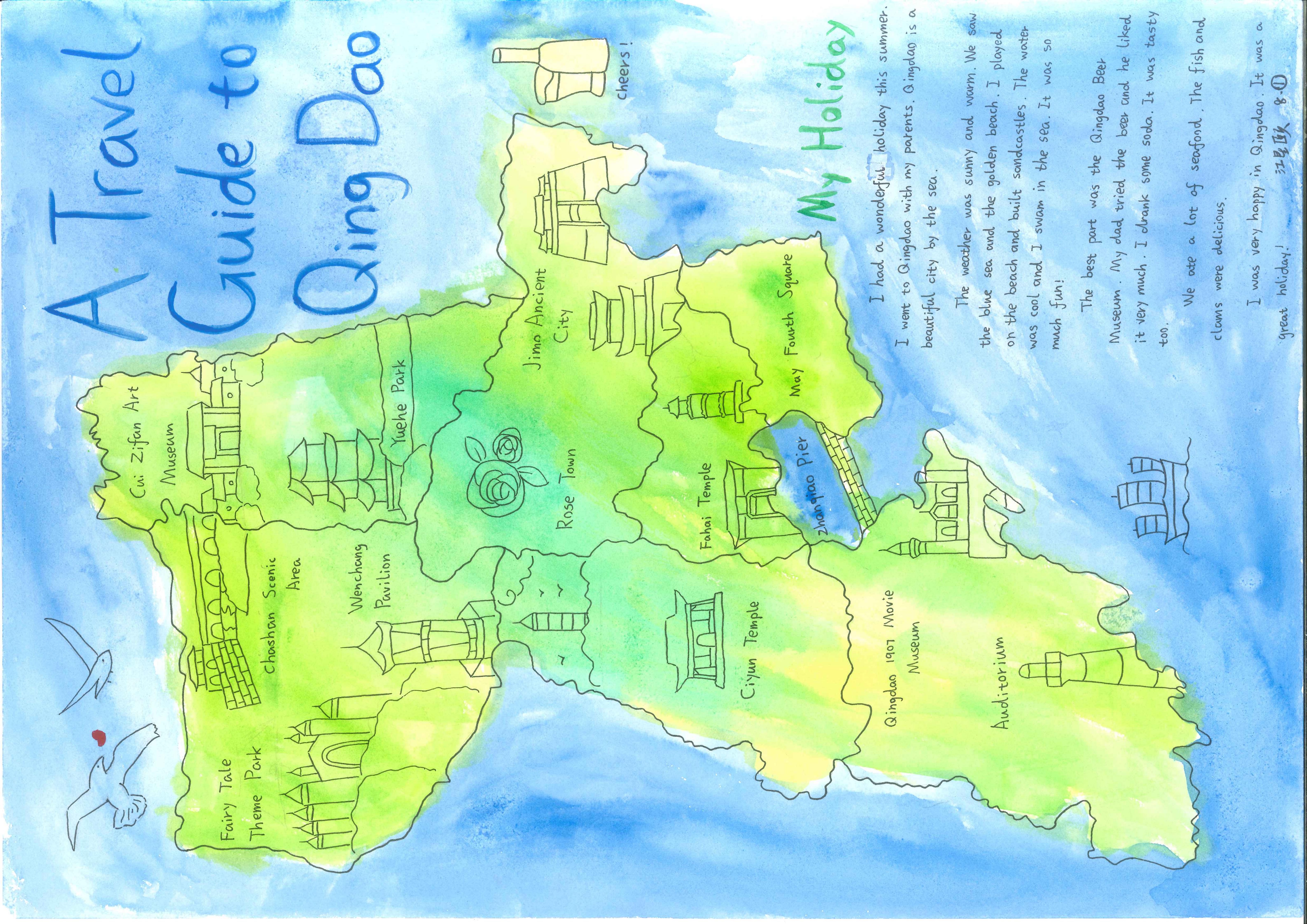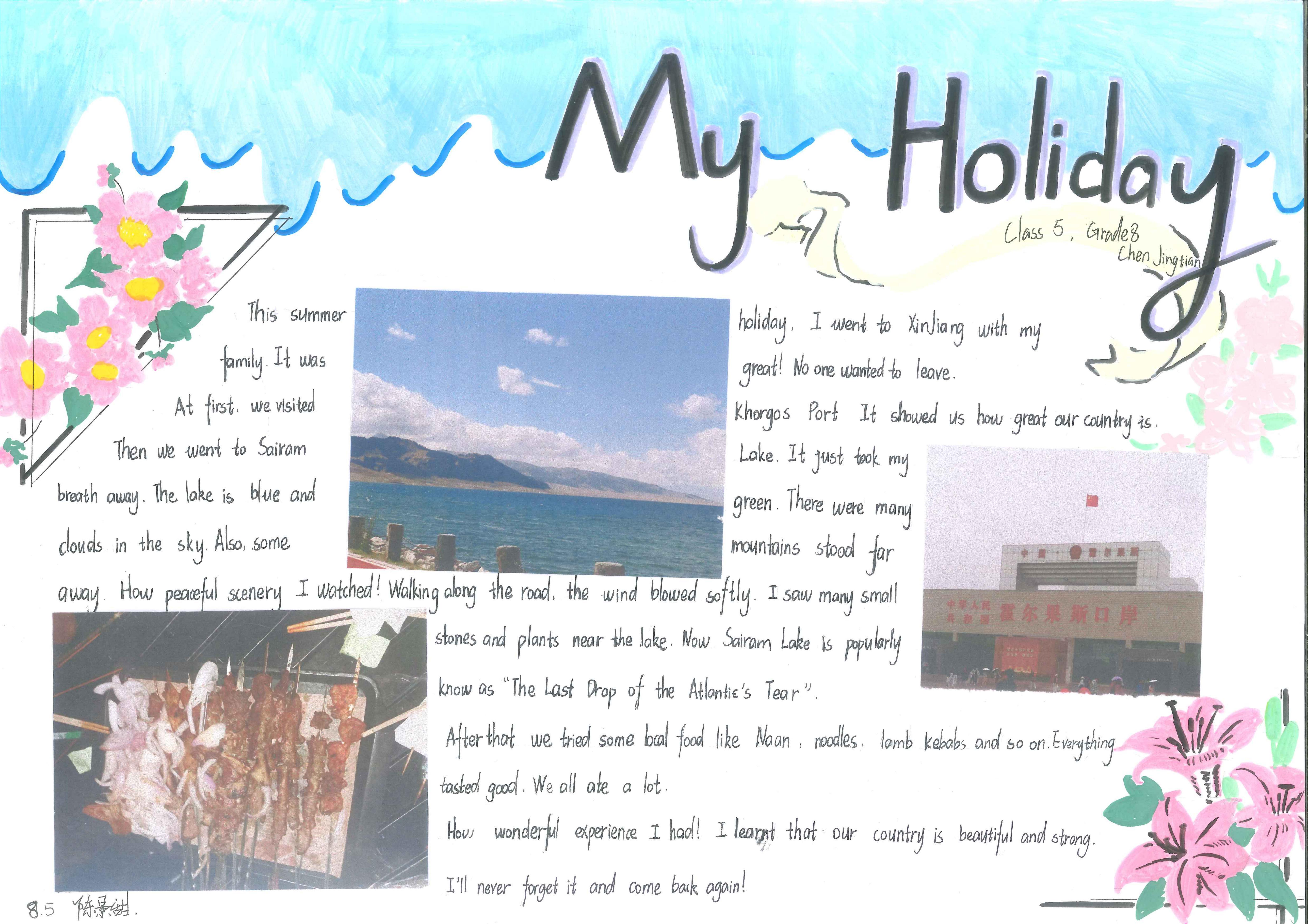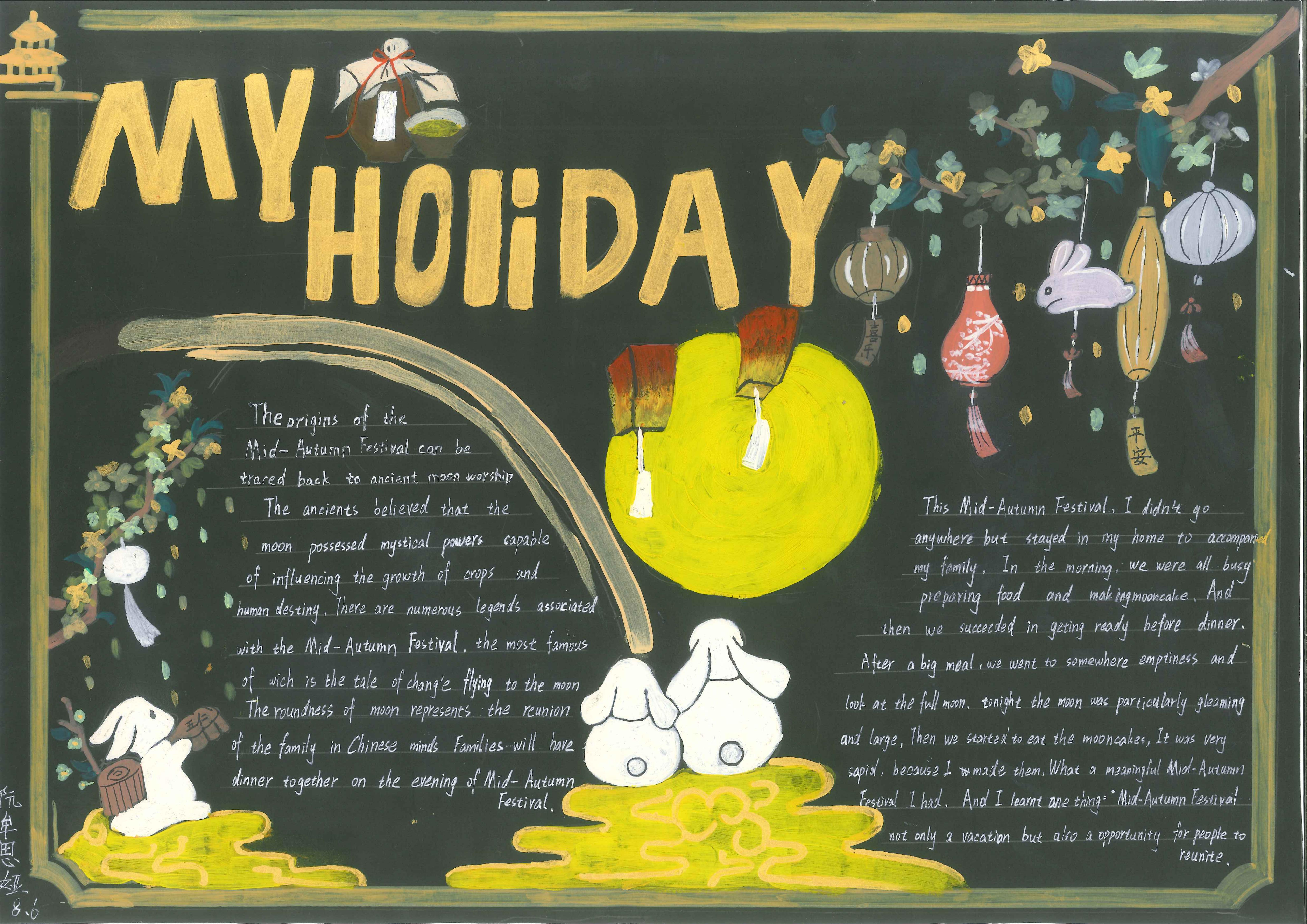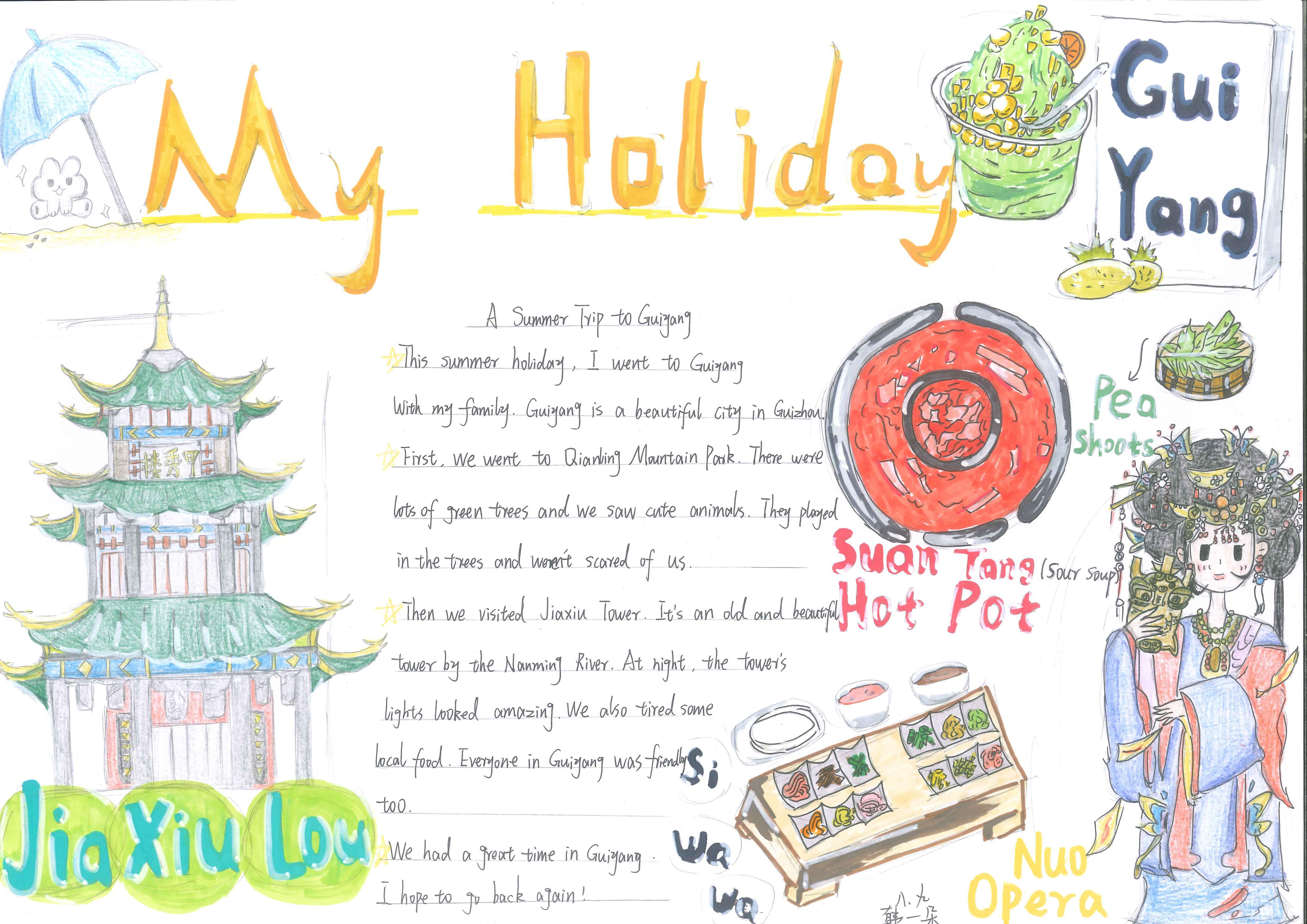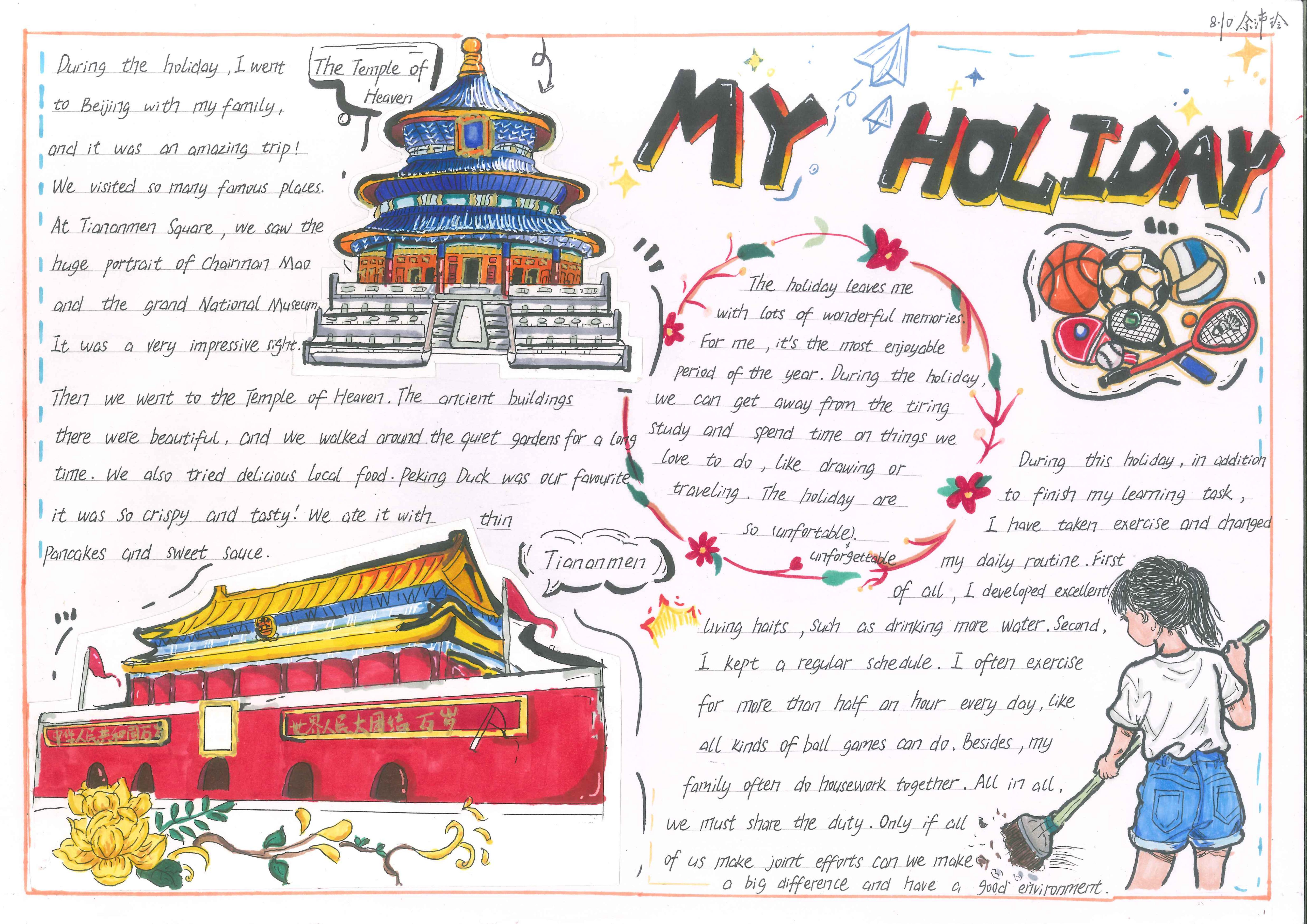 图片二同学们利用国庆假期,围绕“旅行、学习、家庭活动、兴趣发展”等主题,精心设计版面、绘制插图、撰写英文内容。不少同学还创新地加入二维码,链接语音解说,实现信息技术和英语的融合表达。