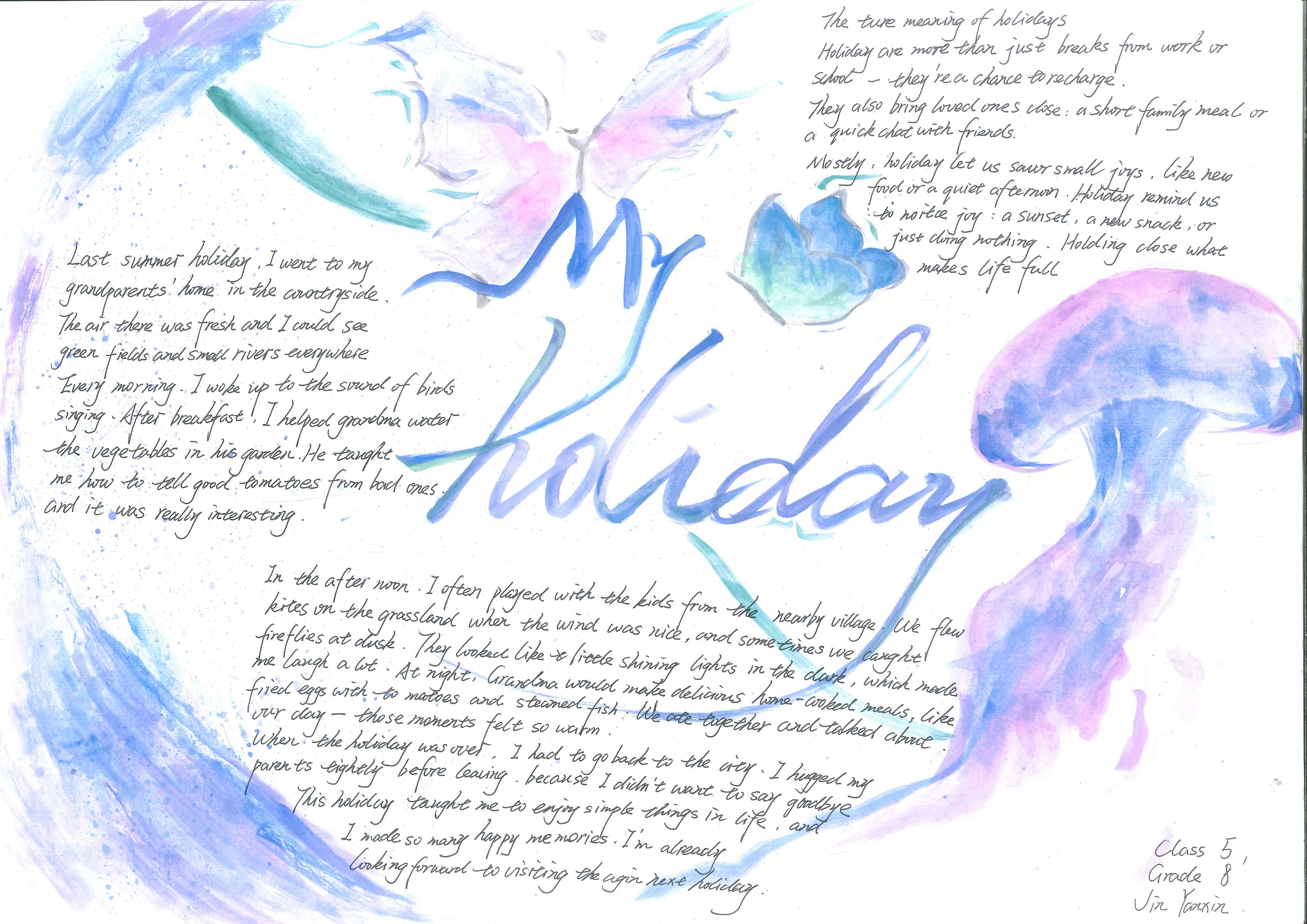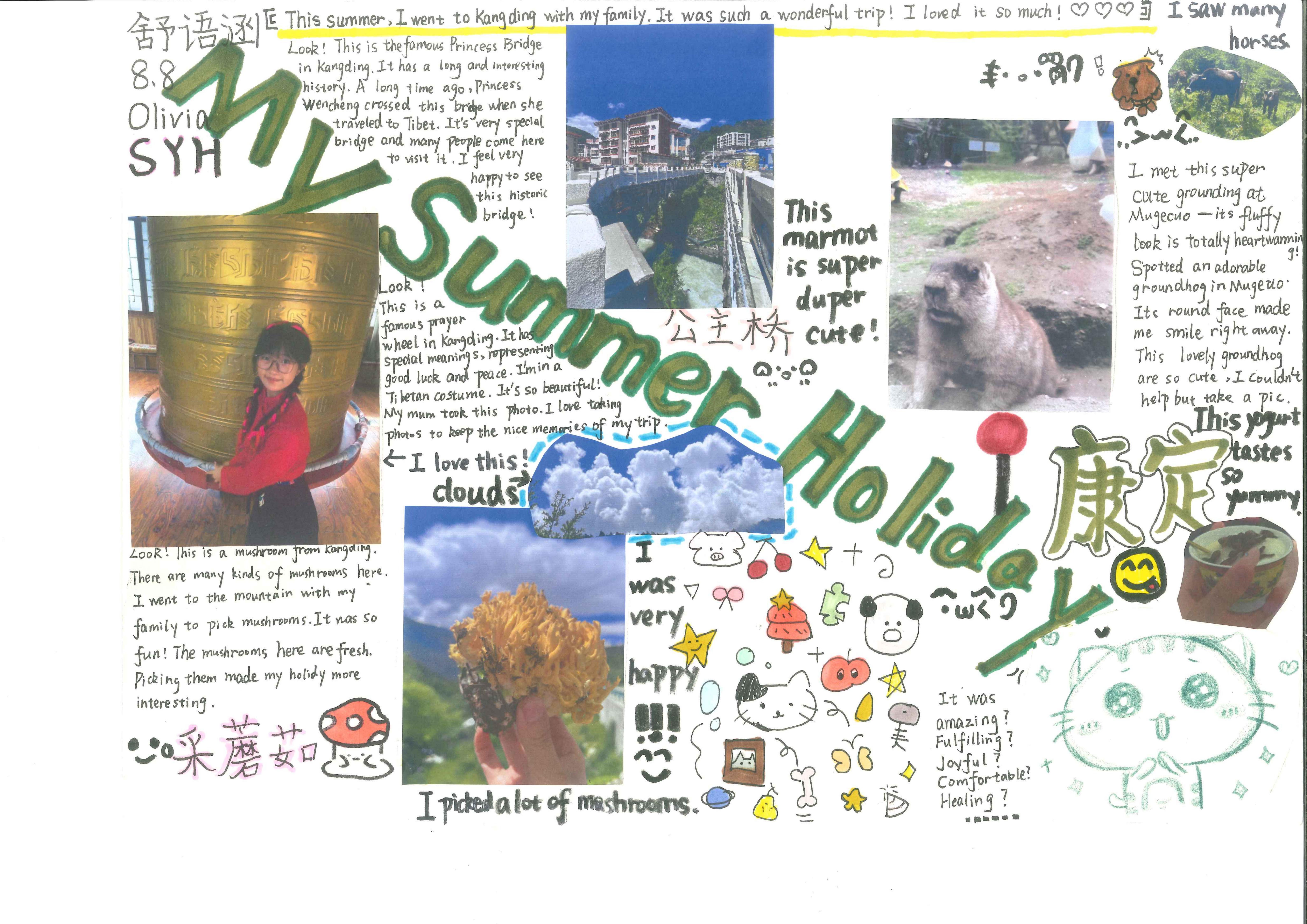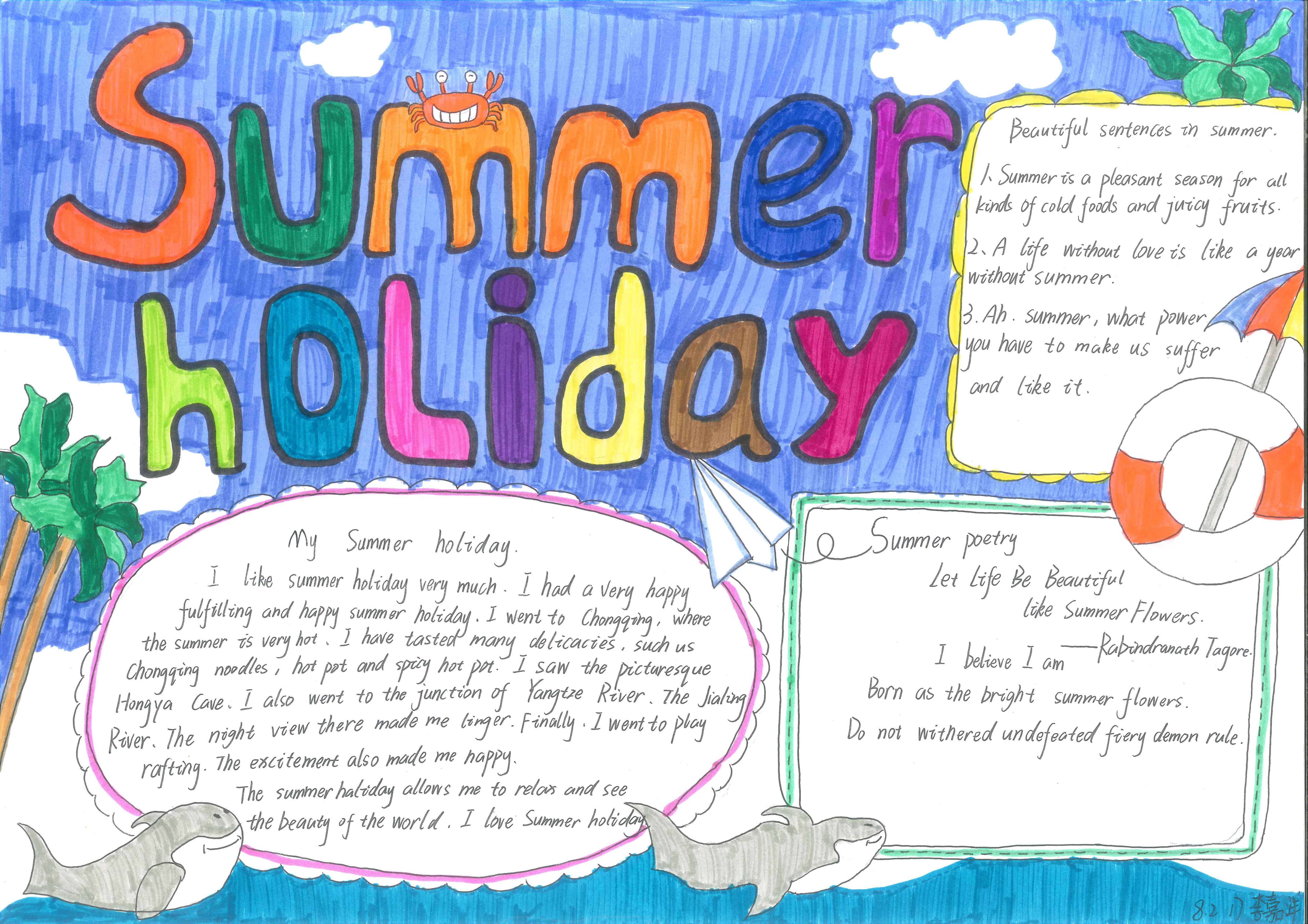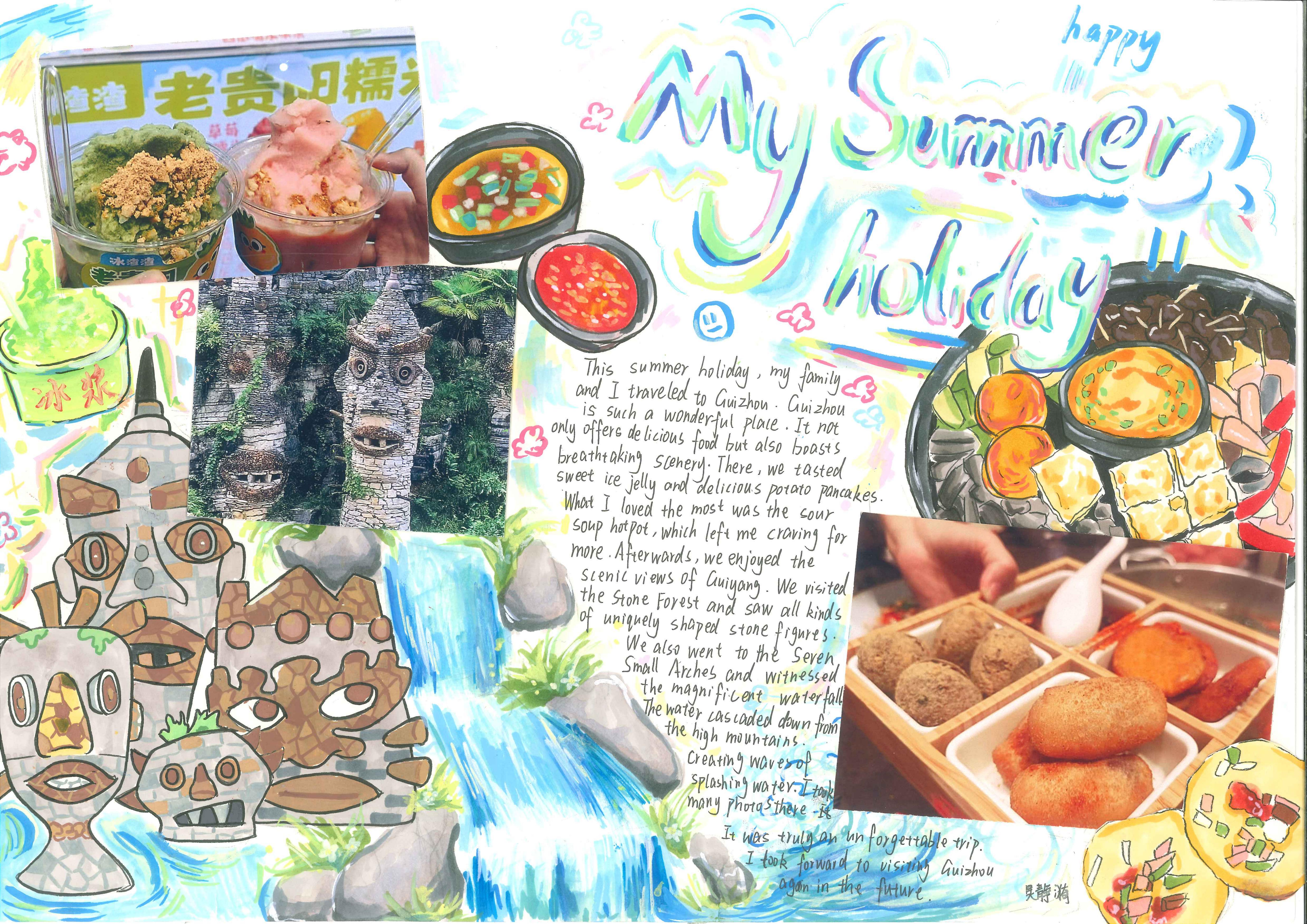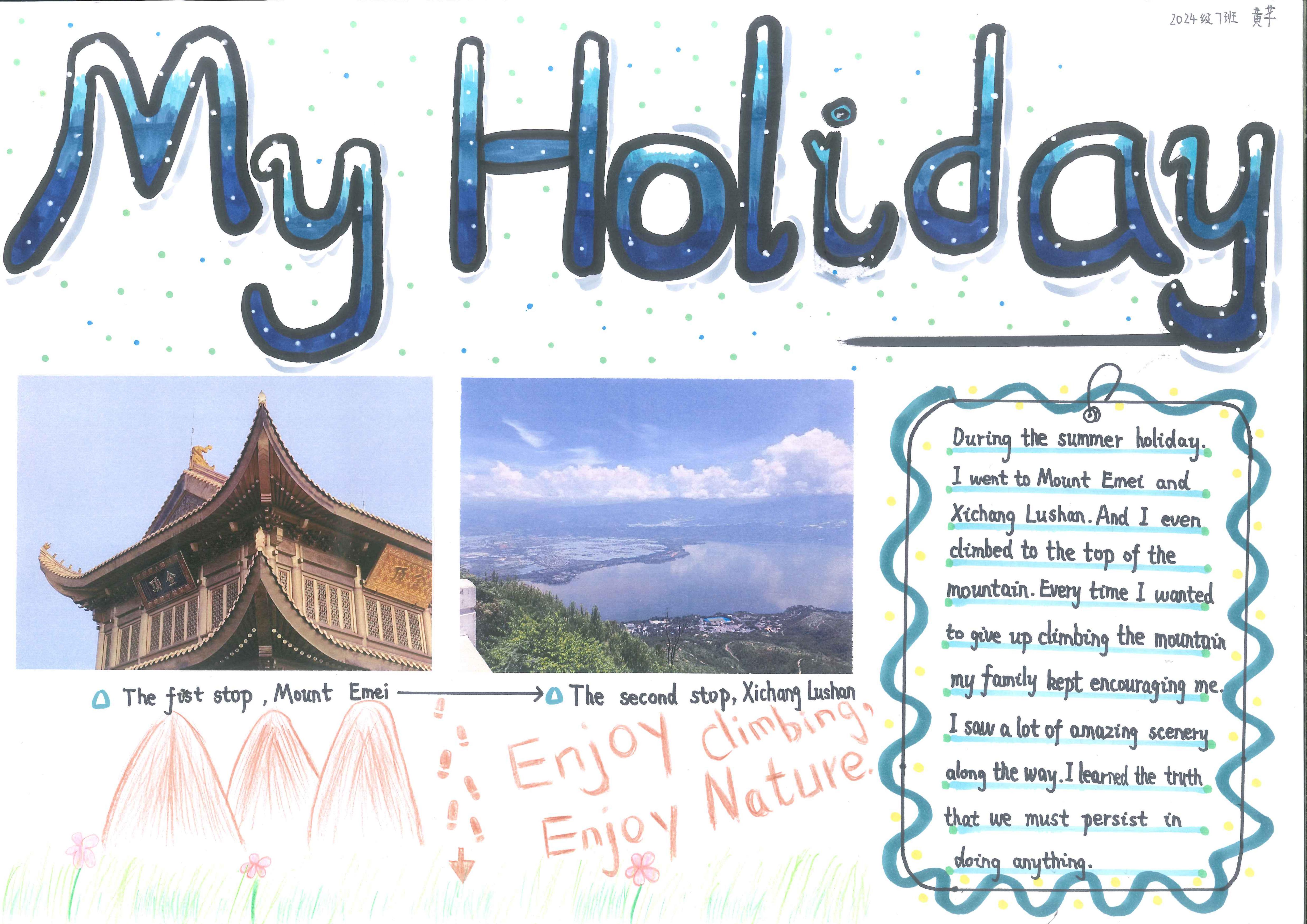 图片十四同学们的每一张海报都是一个小世界,从登山看海到学做烘焙,从回乡探亲到学习编程,展现了同学们丰富多彩的假期生活。不少同学熟练运用目标句型,语法准确、表达地道。原创插图、立体装饰、色彩搭配……每一处细节都彰显审美素养。
