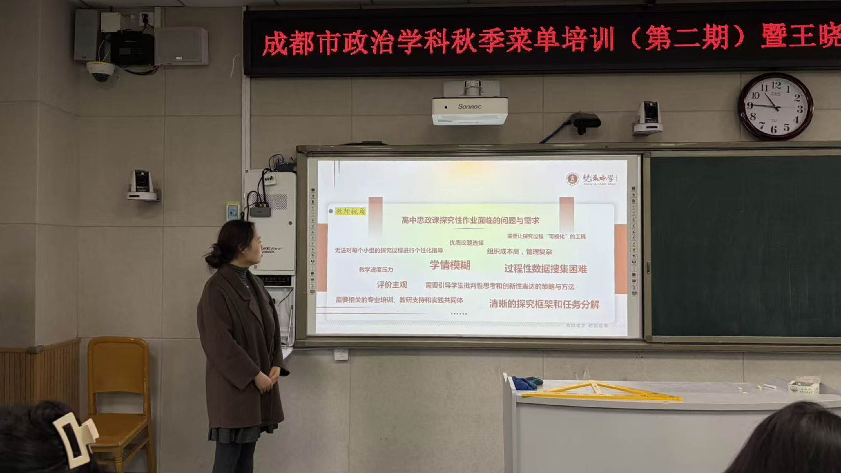 2025年11月14日上午,成都市政治学科秋季菜单培训(第二期)在双流中学成功举办。本次活动与双流区王晓玉名师工作室联合开展,聚焦“智能工具与学情分析”的主题,通过课堂展示、互动研讨与专题讲座,深入探索人工智能与思政教育深度融合的实践路径。