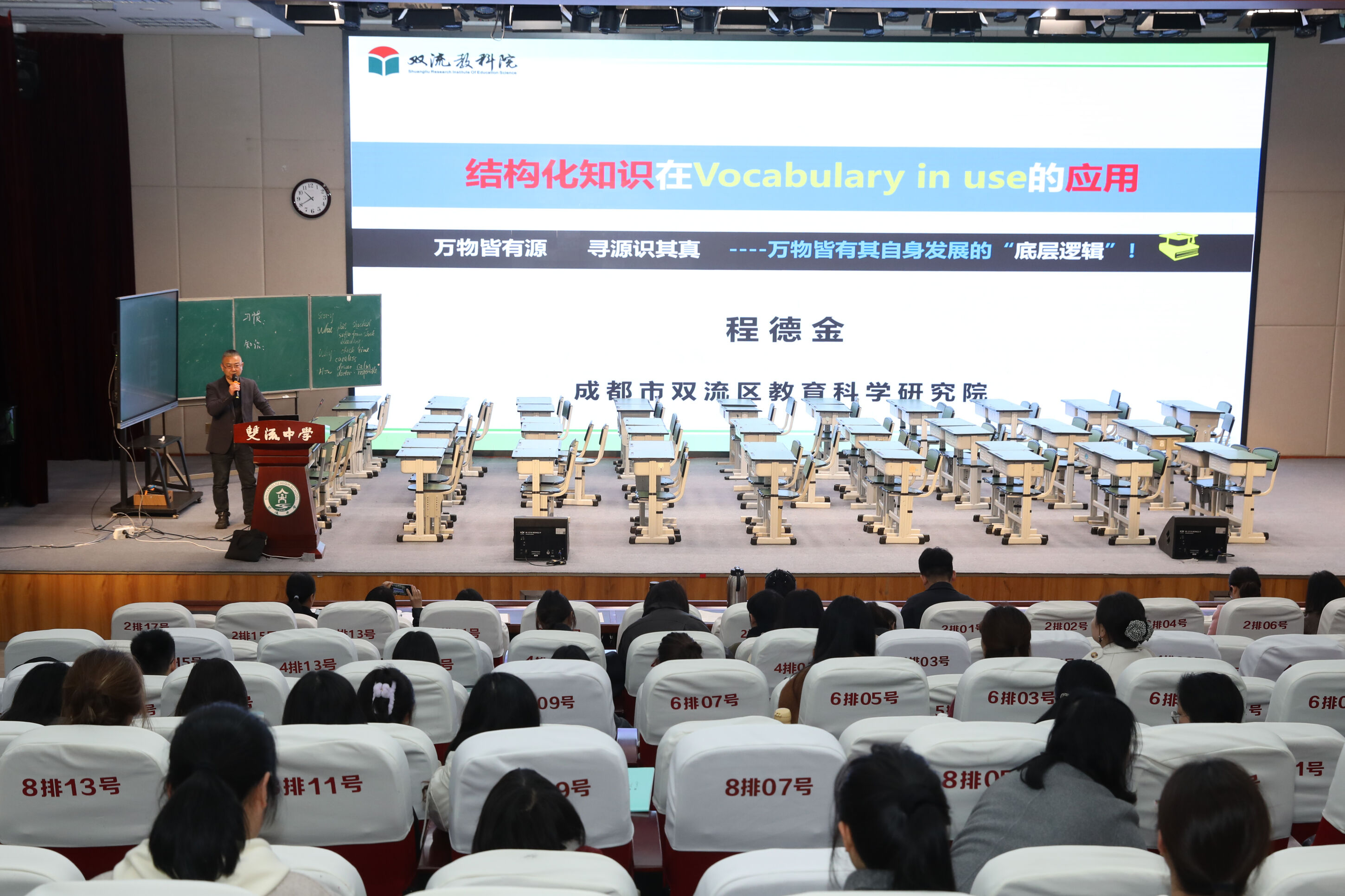 最后,双流区教育科学研究院英语教研员程德金老师为会议作专业指导。他首先对本次活动的精心组织和丰富内容给予高度评价,充分肯定了付利娟老师的课例、郭艳老师与何艳林老师的专题分享,以及双流中学八年级英语备课组在“防分化·促托底”方面取得的成效与示范作用。随后,程老师围绕“结构化知识在Vocabulary in Use中的应用”展开专题指导。他精准阐释了如何将教材中的“结构化知识”通过学习过程中的“知识结构化”,最终内化为学生头脑中的“结构化知识”。他强调,教材解读应关注单元主题发展的内在关联与递进性,并给出了具体实施路径。结合当日课例,他进一步提出在Section B “Vocabulary in Use”教学中引入“Vocabulary Focus”的概念,与Section A的“Grammar Focus”形成呼应。他还重点分享了词汇教学策略及核心词汇巩固运用的方法,强调要将词汇学习融入完整的主题意义探究之中,在真实、有意义的语境中构建主题词汇语义网。通过多个词汇教学案例与实操方法的展示,程老师引导老师们在日常教学中探寻“万物皆有其自身发展的‘底层逻辑’”。