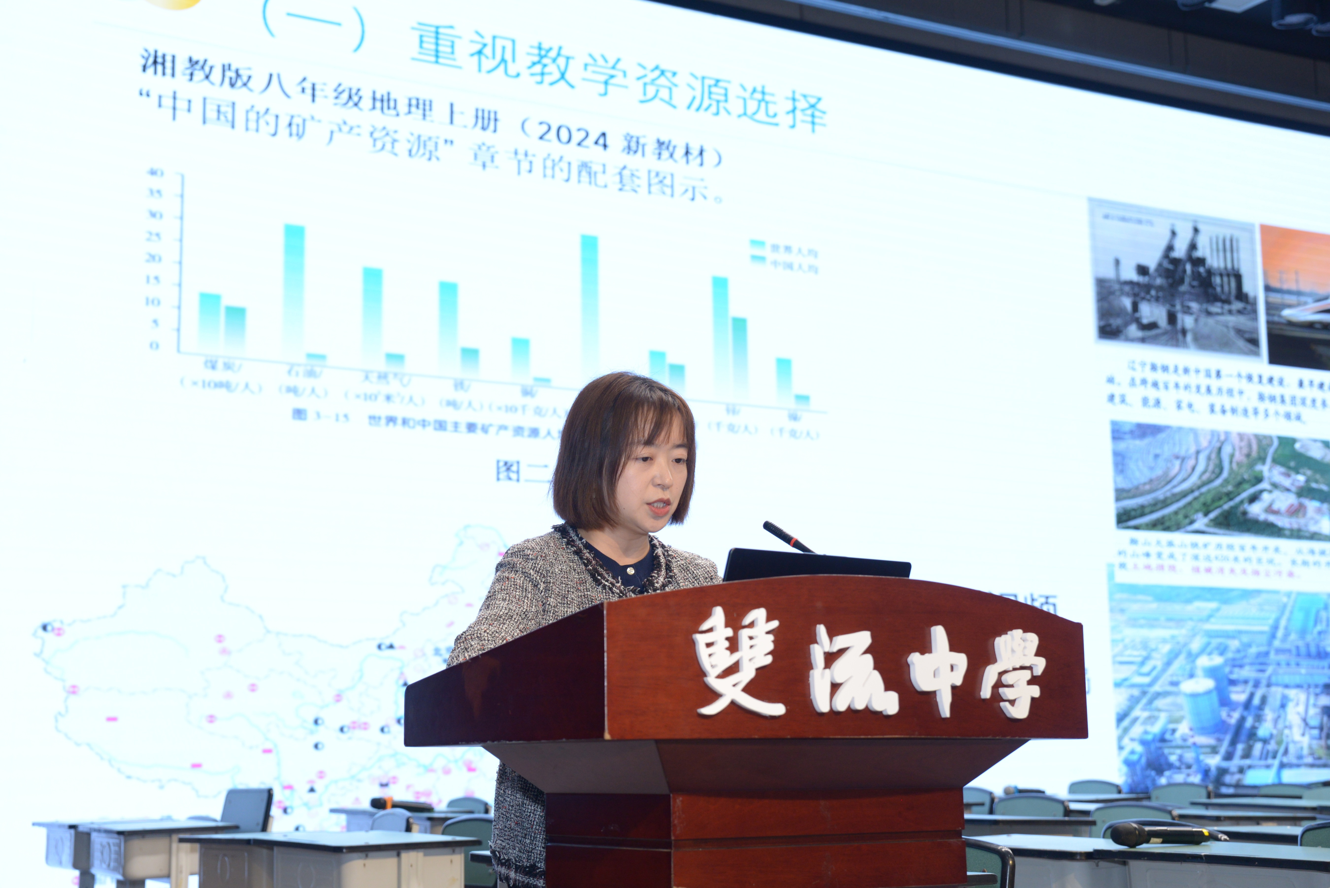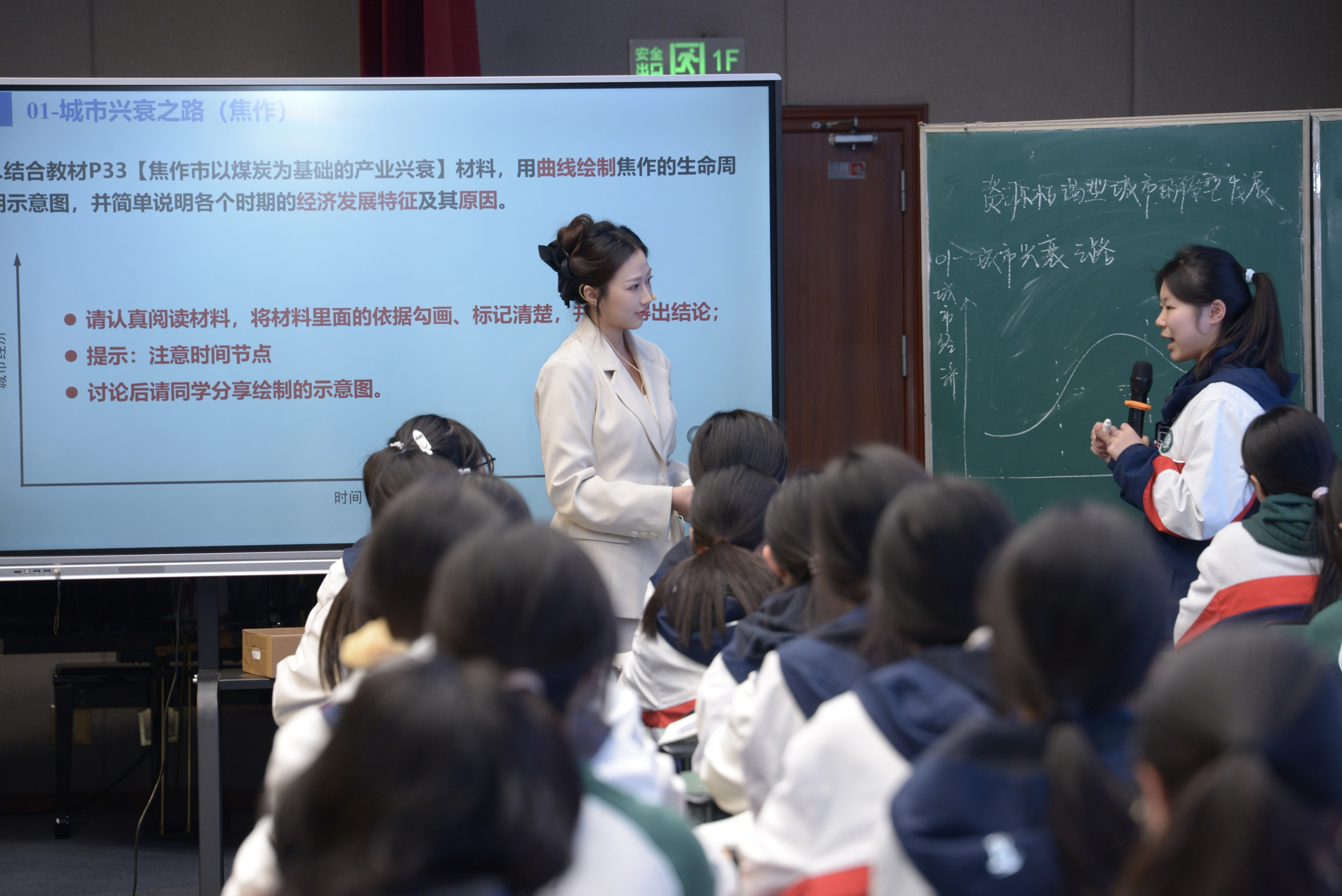 图片2 双流中学屈惠平老师上展示课双流中学张佳艺老师呈现《资源枯竭型城市的转型发展》一课。以焦作“从煤城到绿城”的真实变化为切入点,通过绘制资源型城市生命周期曲线、角色扮演“转型专项工作组”等方式,引导学生探究转型路径。课程对比焦作与大庆两种模式,提炼“宜转则转、宜深则深”的因地制宜思想,实现知识传授、能力培养与价值塑造的有机统一。