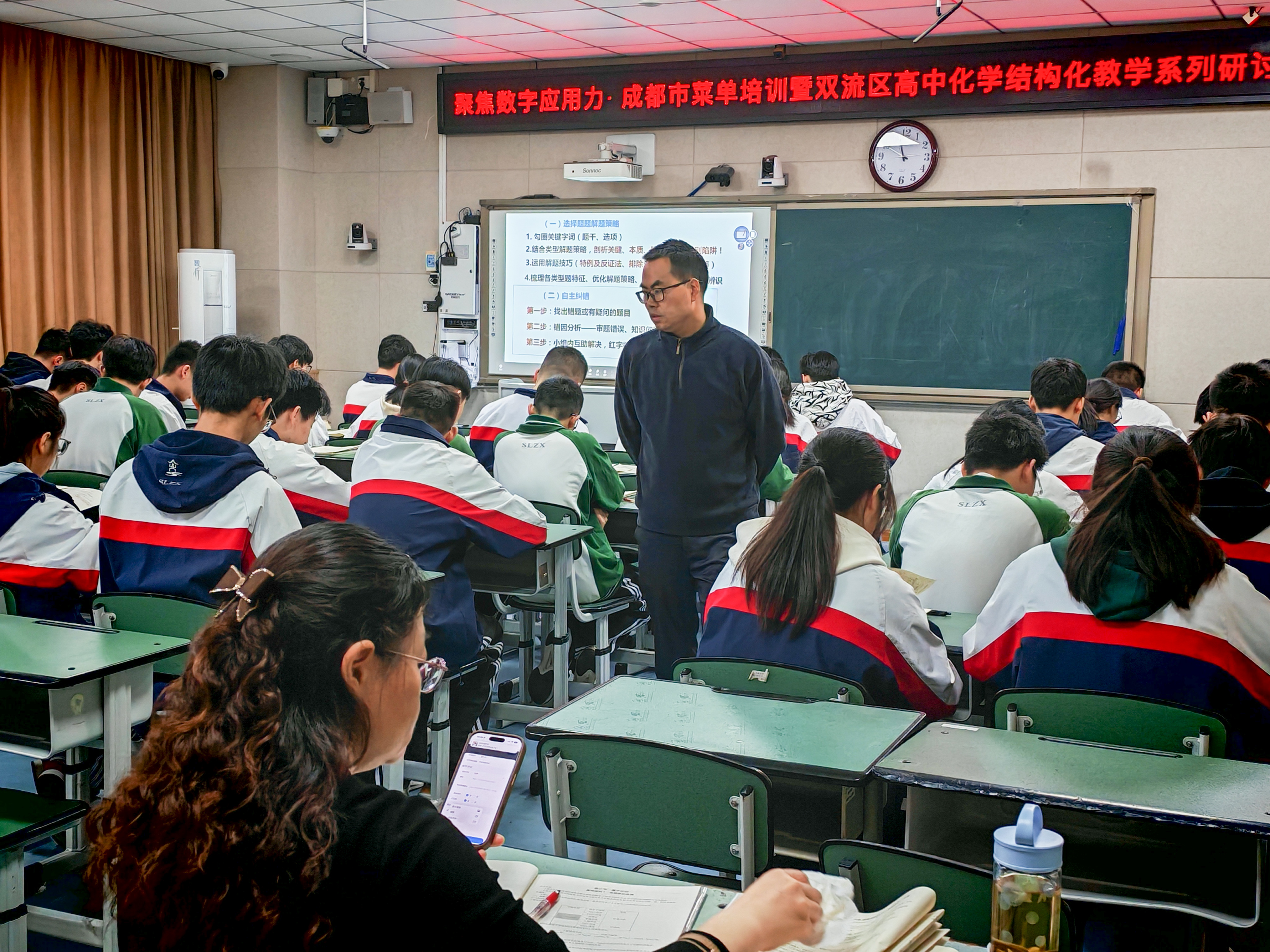 图2 老师们认真听课随后,四川省双流中学缪小平老师以《高三化学周练 3 试卷评析》为题,呈现了一堂精准高效的试卷讲评课。课堂以数字化学情数据为切入点,精准定位学生答题的进步点与失分痛点,构建了 “数据诊断明目标—自主纠错析错因—聚焦题型破难点—模型建构固能力” 的试卷讲评课结构化范式。