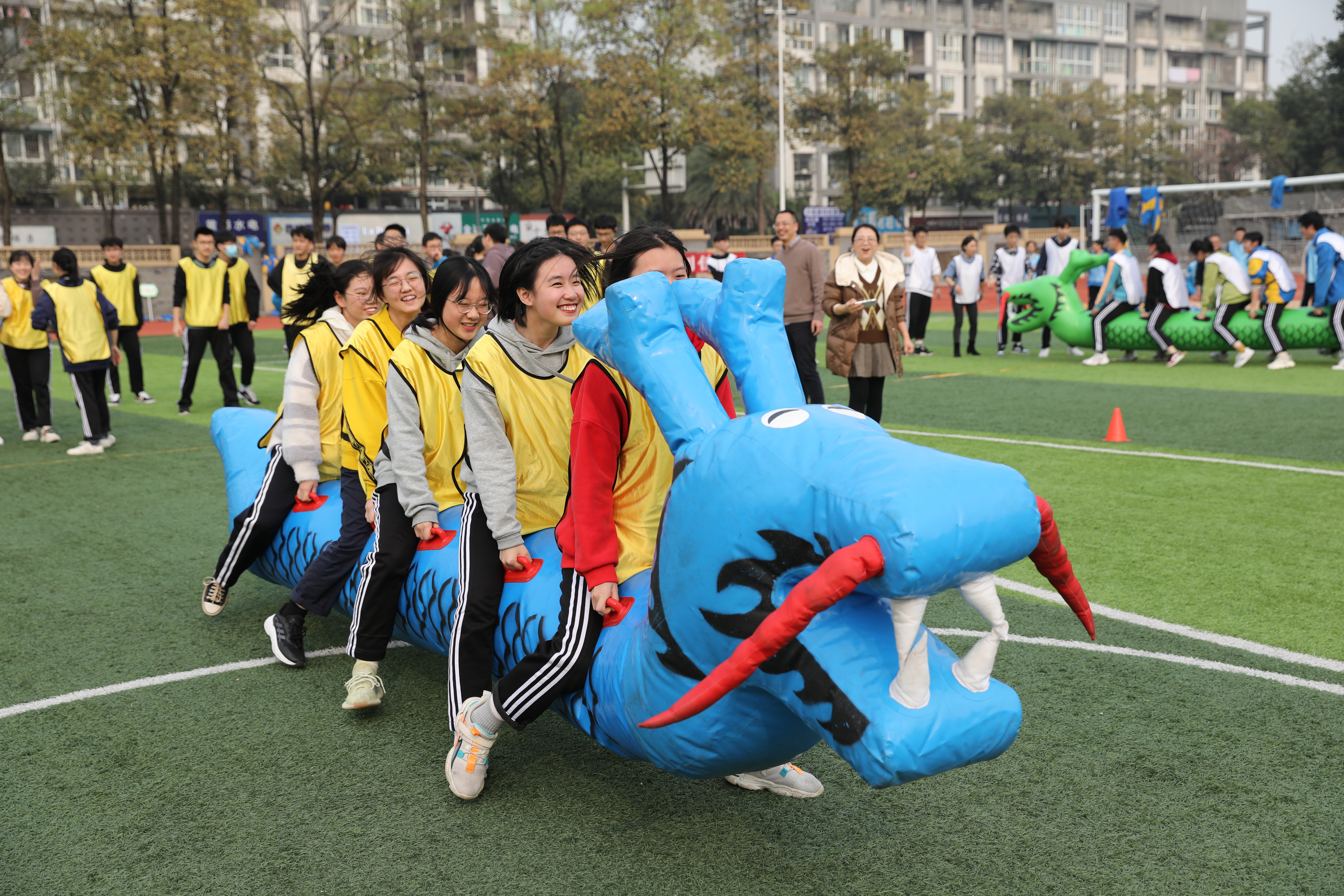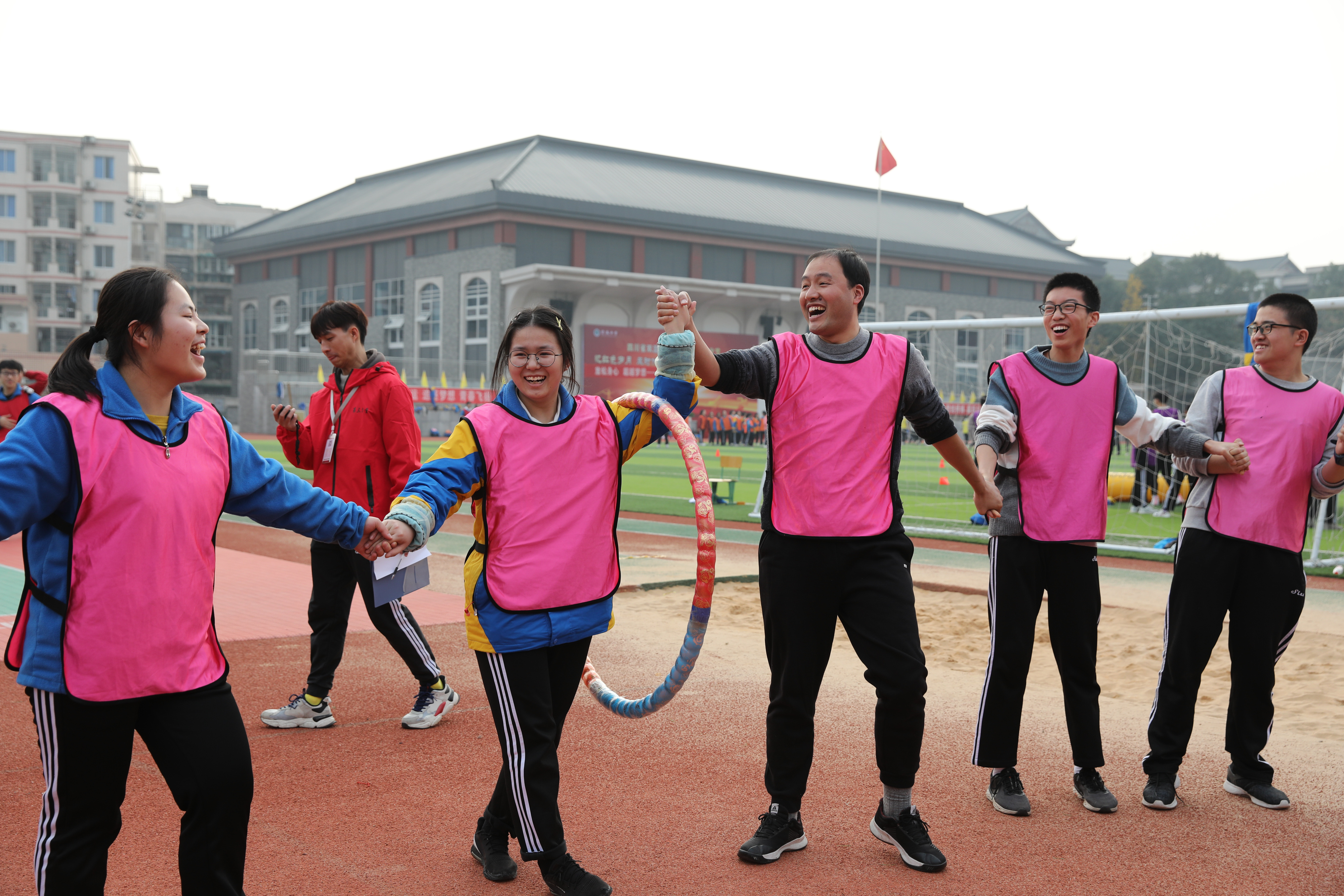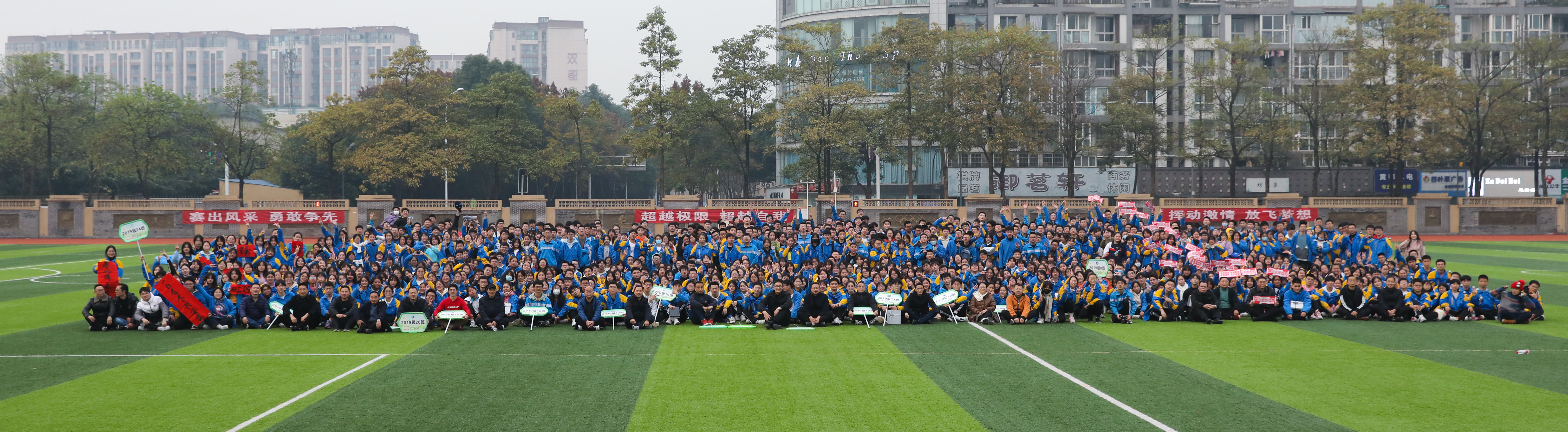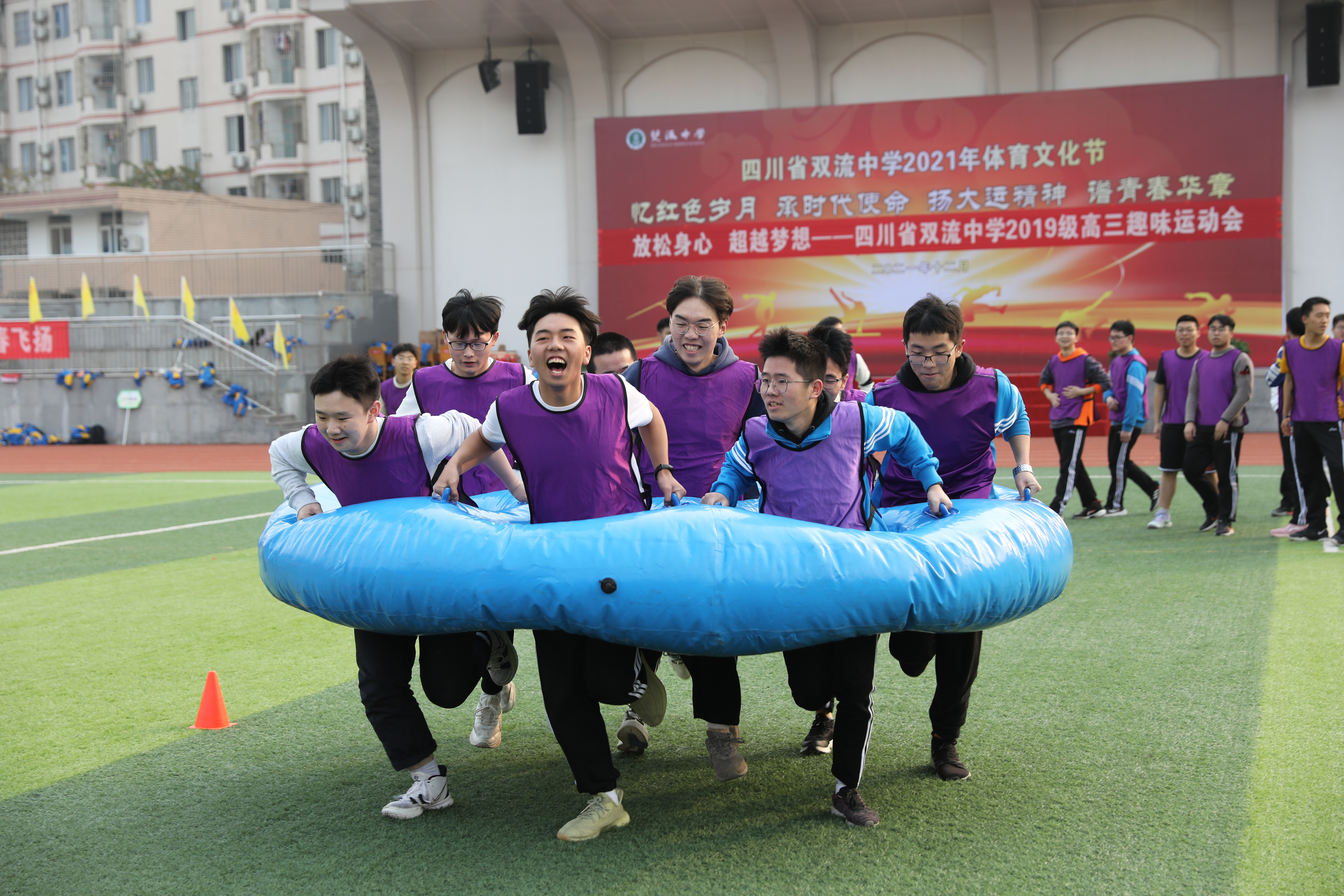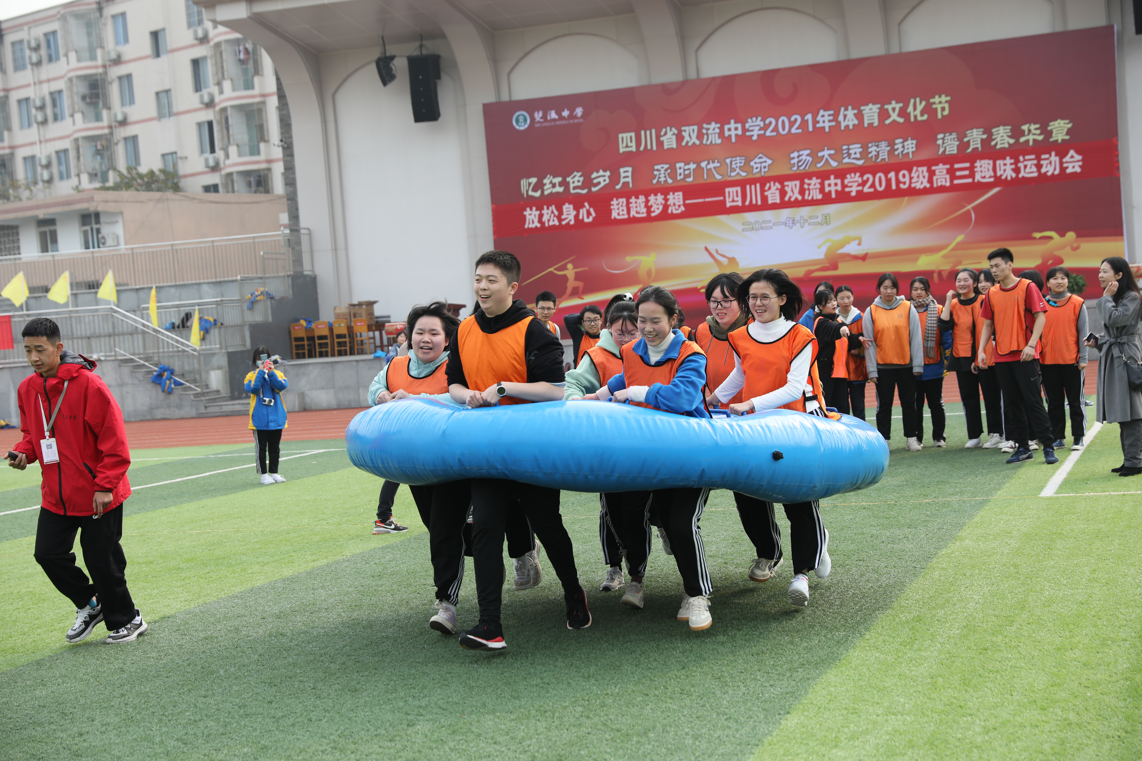 冬月初一,暖阳杲杲。双流中学运动场主席台上方,“放松身心•超越梦想——双流中学2019级高三趣味运动会”的大红条幅熠熠生辉。
