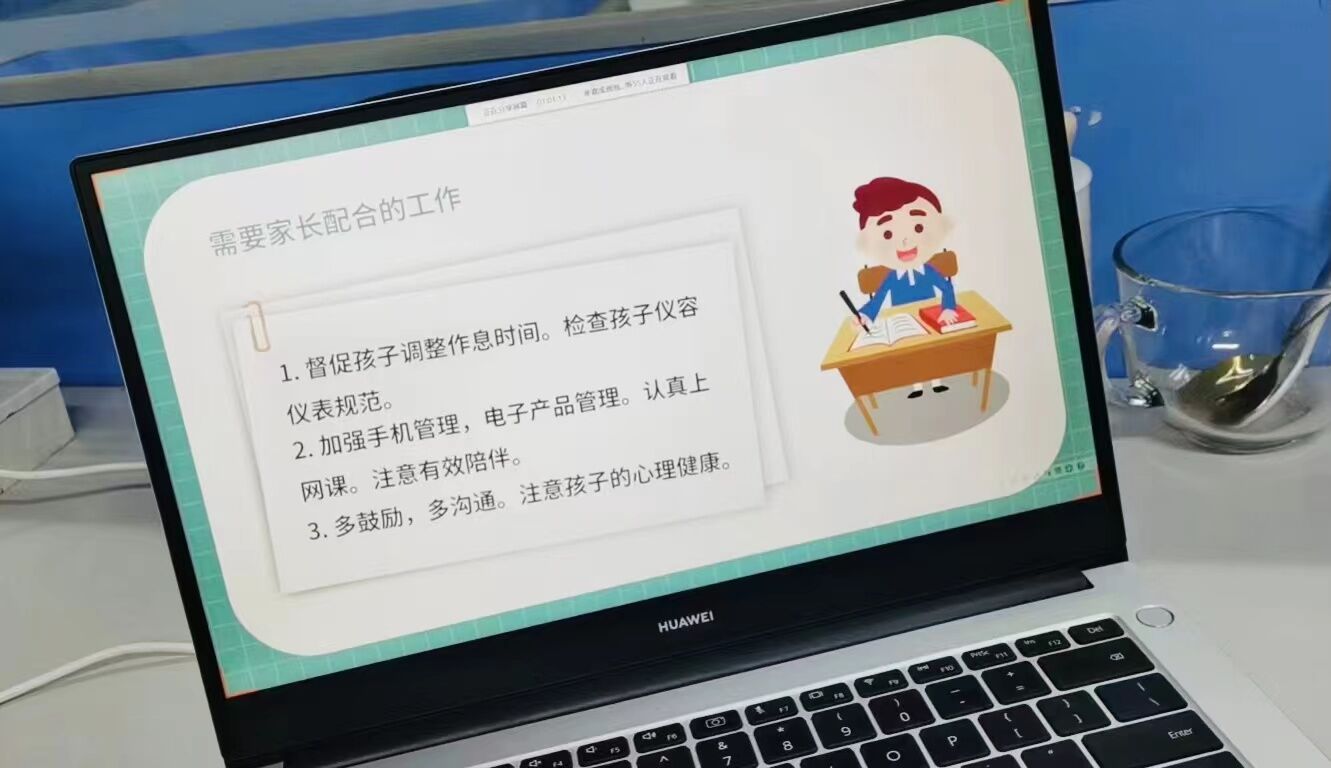 最好的教育是家庭与学校同袍同泽,偕作协行。为了让网课在家庭和学校的合力中有序而高效,我们通过网络平台召开了家长会与主题班会,将关于网课的各项事宜及时传达到每一位学生和家长心中,隔空传递爱,让学生安心在家学习。