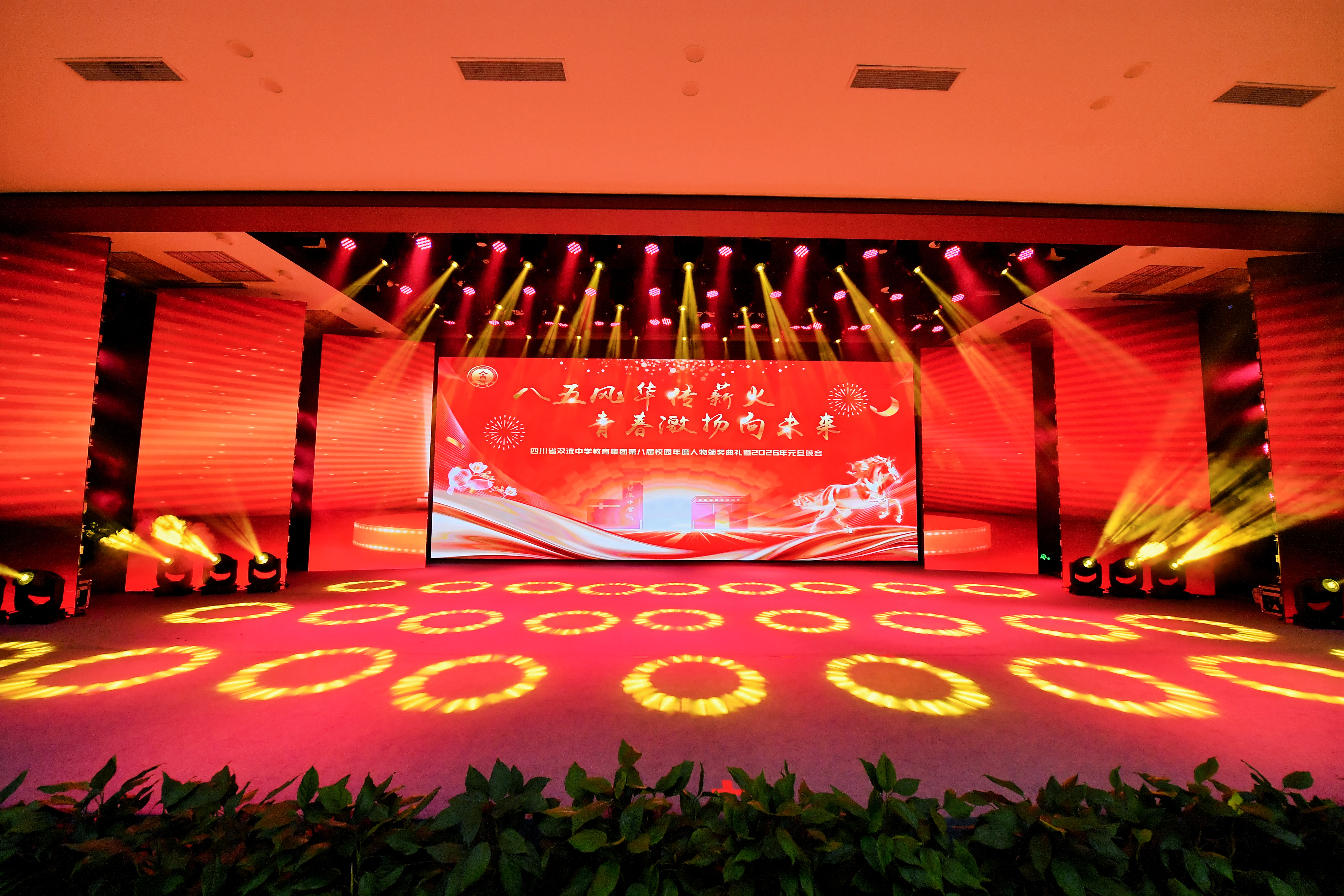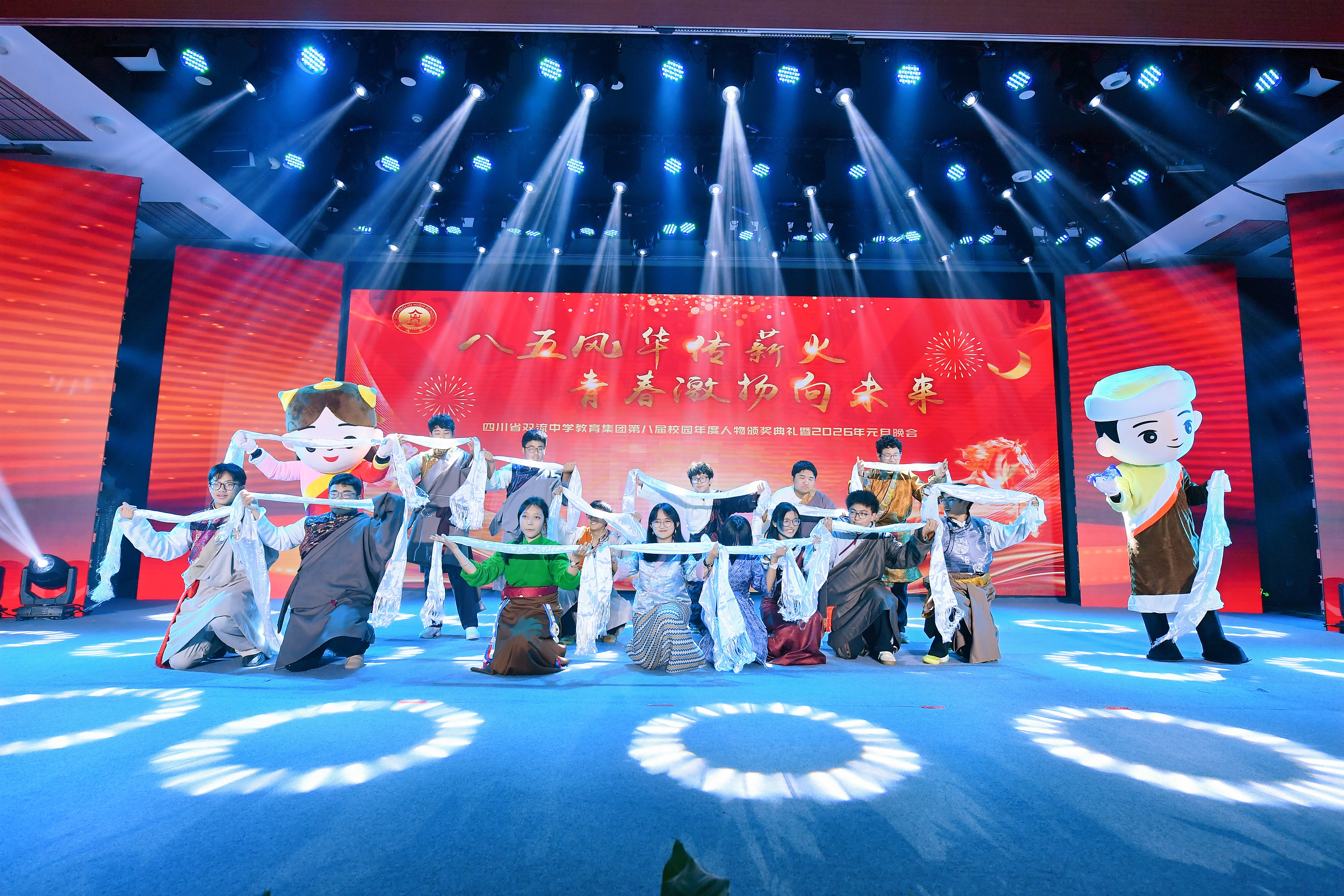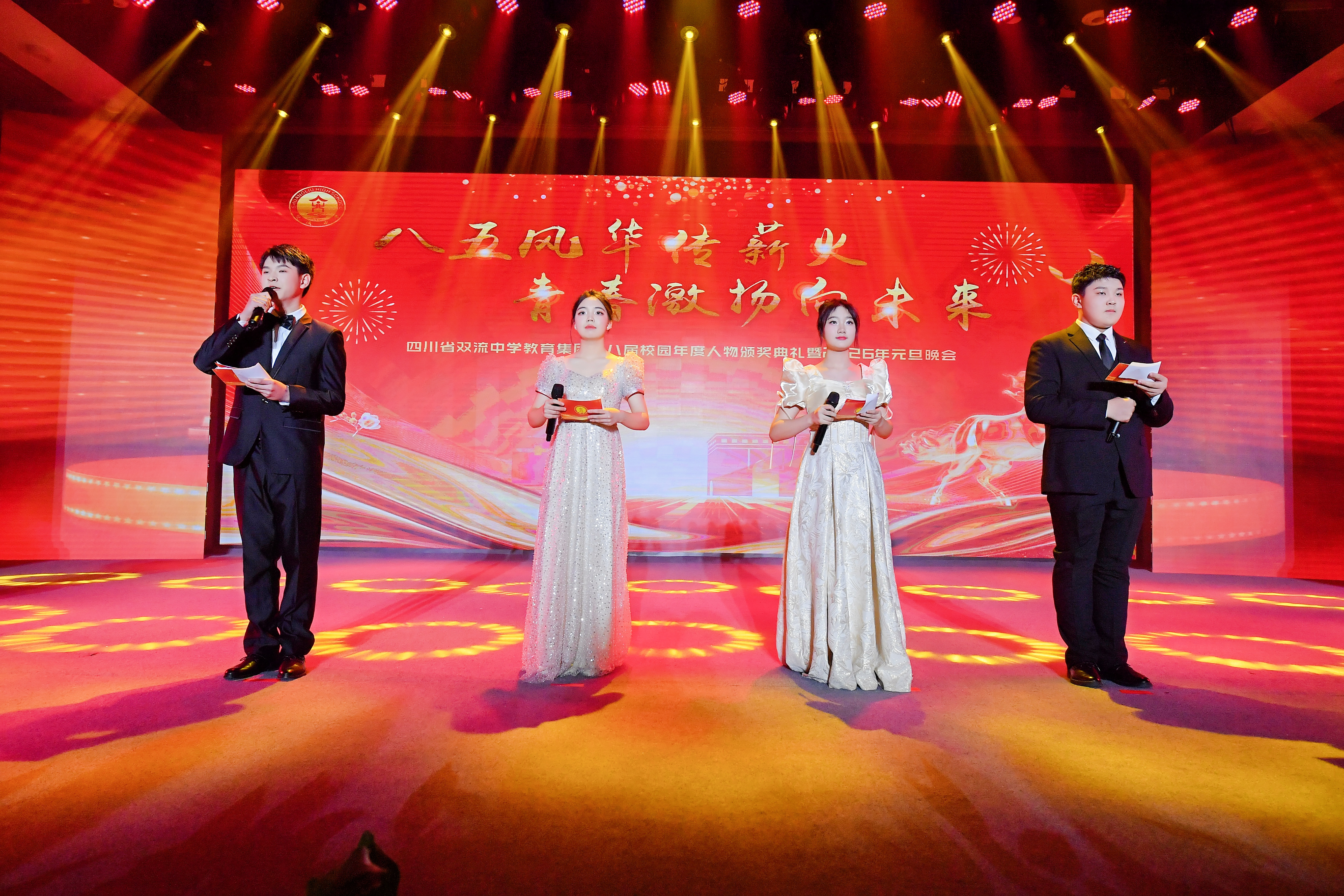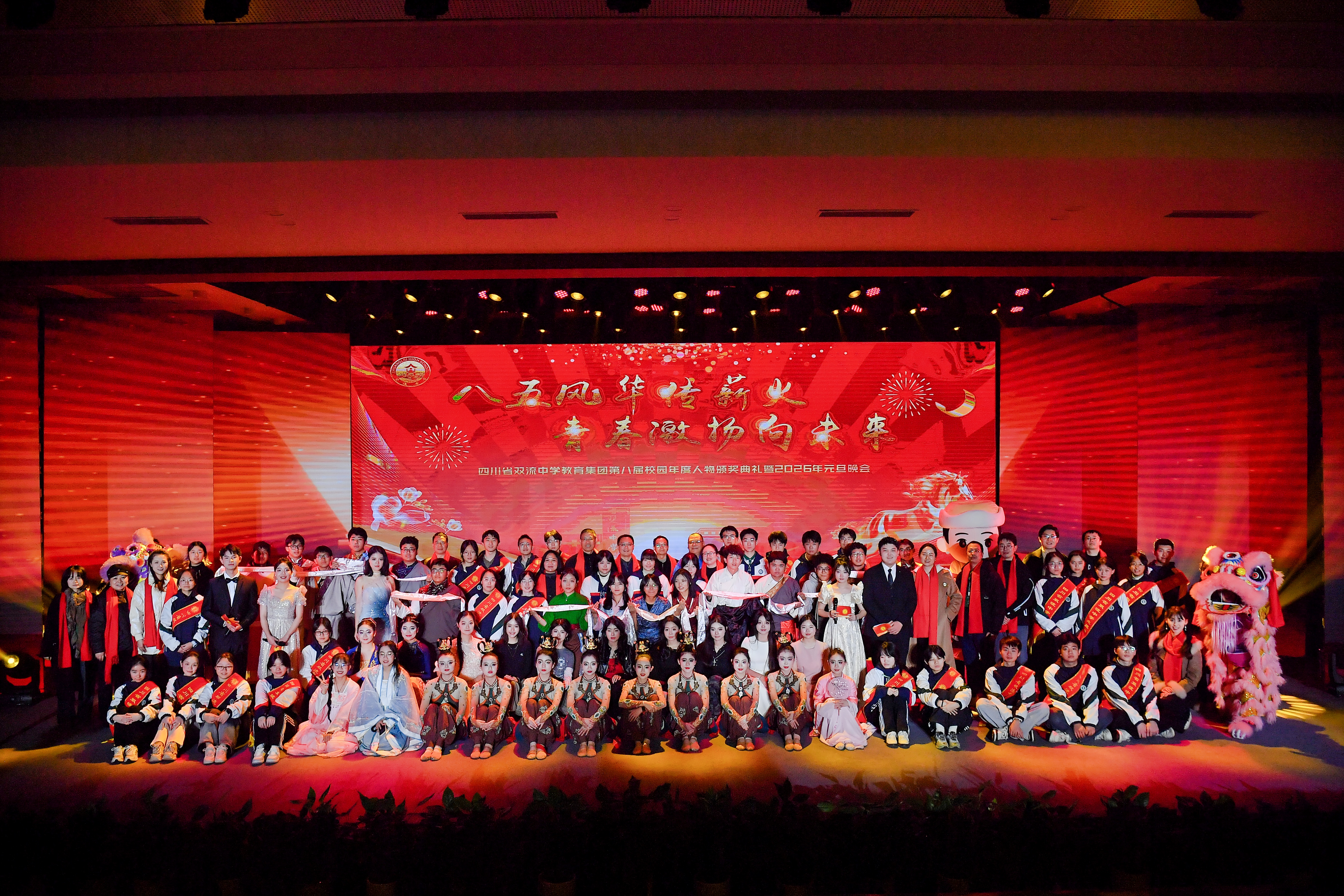 灯光璀璨映校园,歌舞飞扬庆新元。2025 年 12 月 26 日,四川省双流中学教育集团第八届校园年度人物颁奖典礼暨 2026 年元旦晚会盛大举行。来自集团各校的师生们欢聚一堂,以文艺为翼、以榜样为光,在辞旧迎新的美好时刻,共赴一场融合传统与青春、承载荣誉与梦想的视听盛宴。