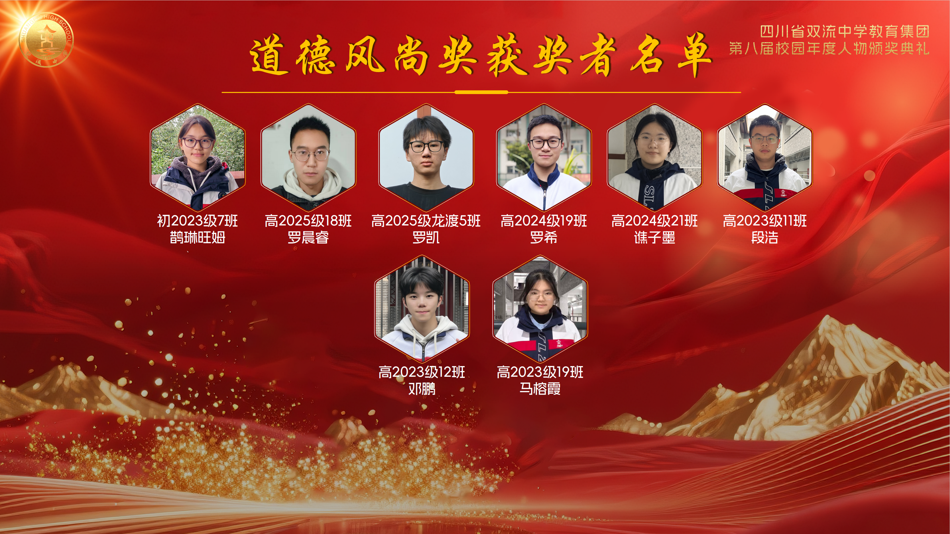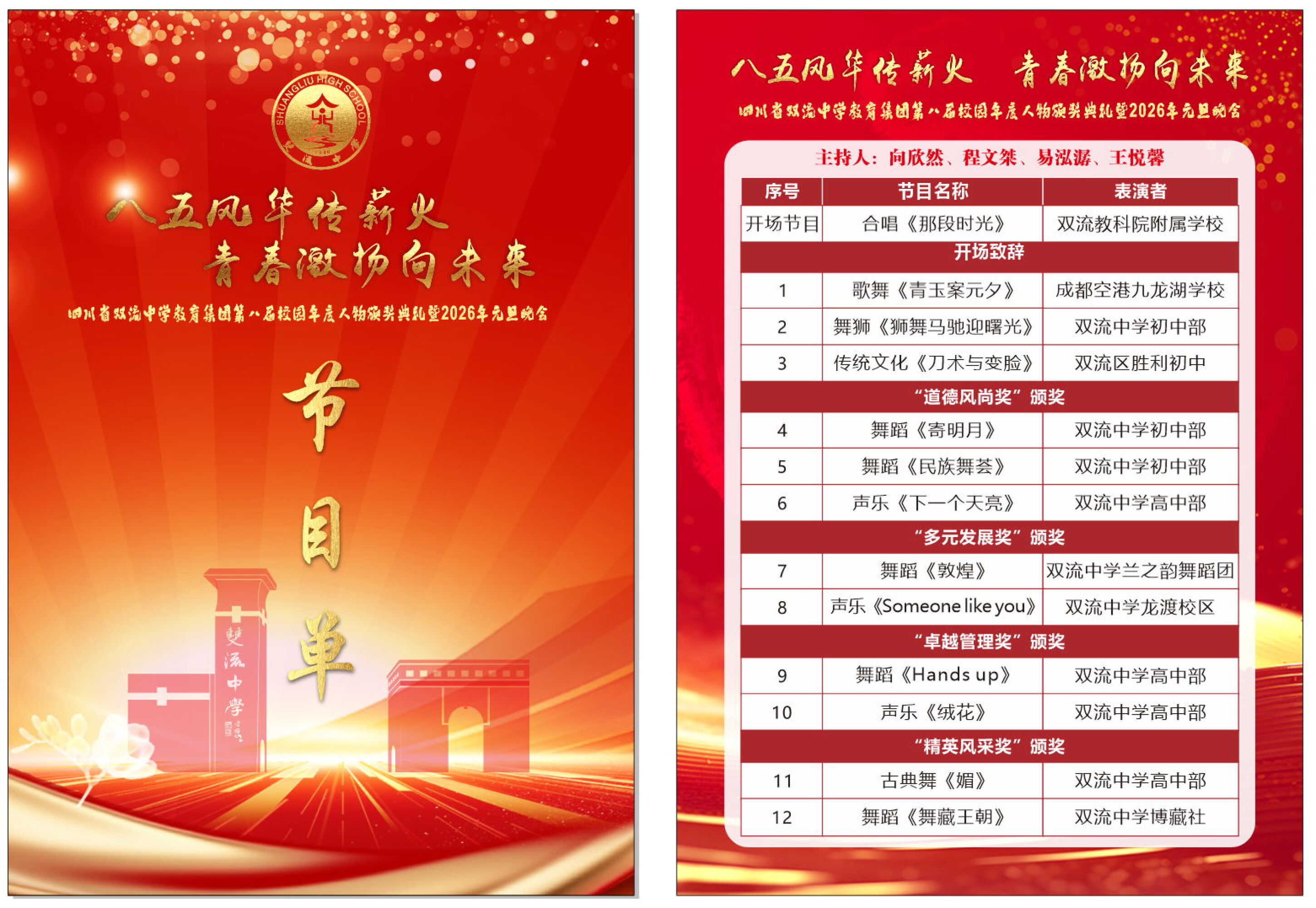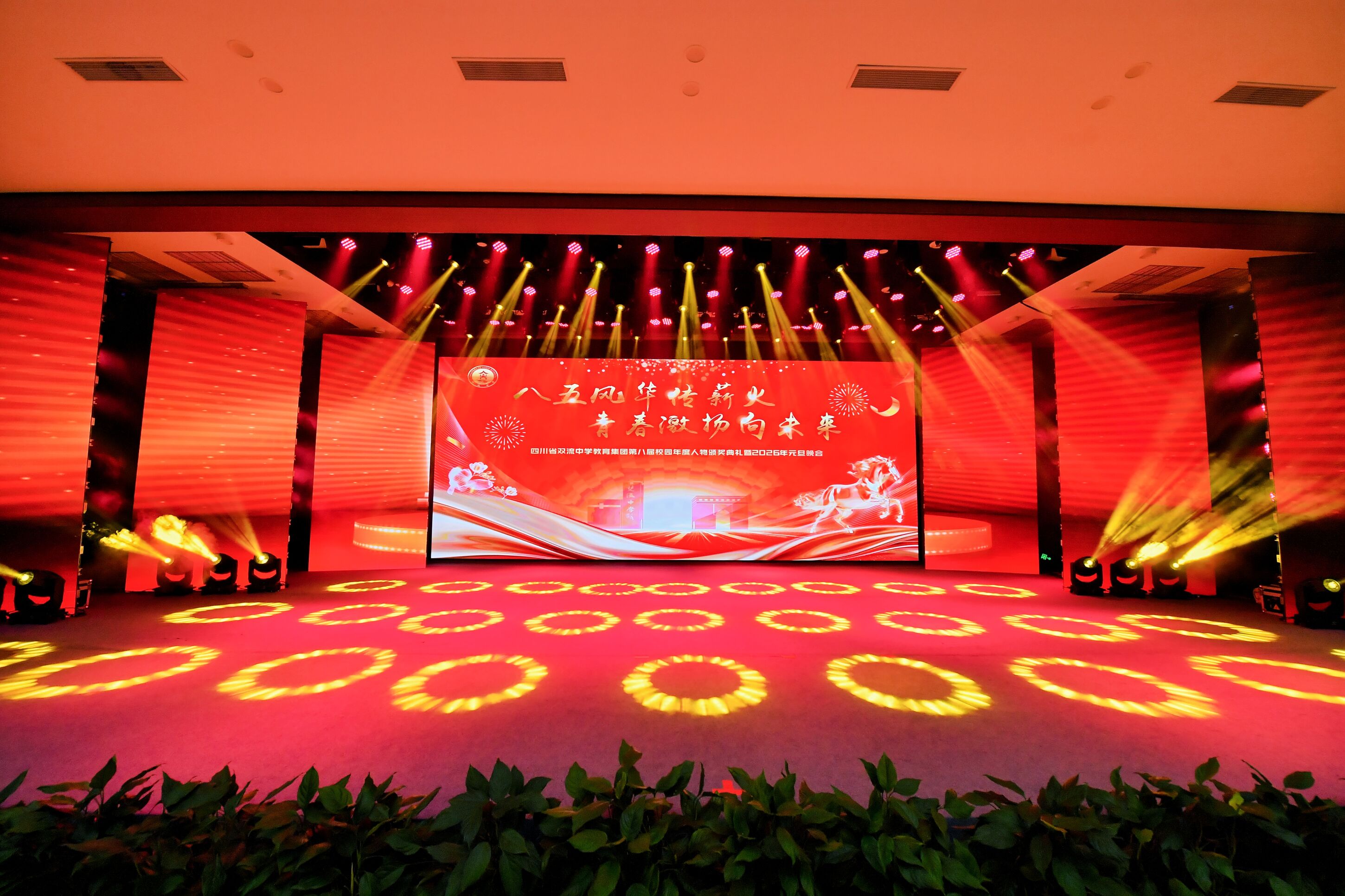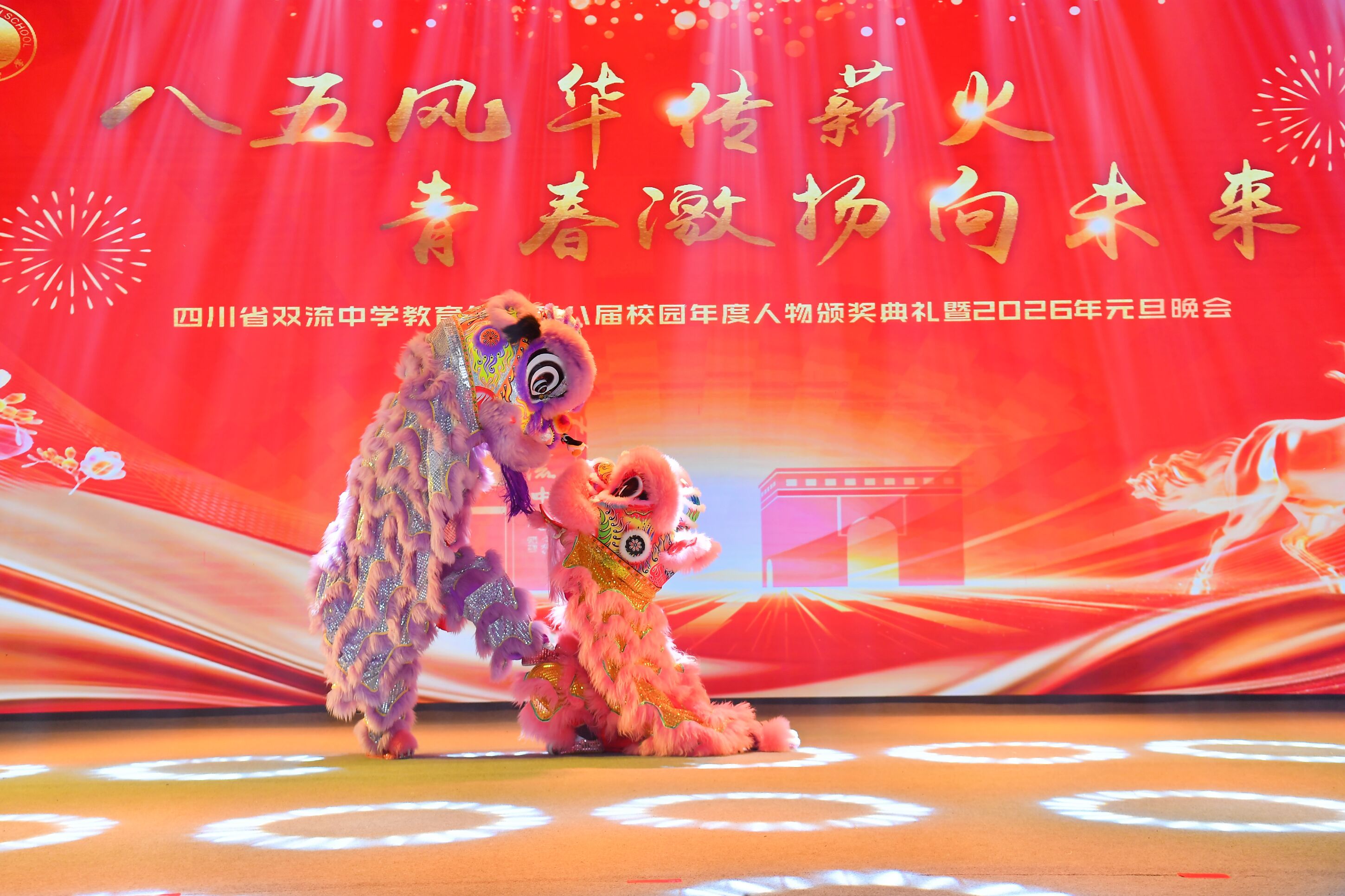 灯光璀璨映校园,歌舞飞扬庆新元。2025 年 12 月 26 日,四川省双流中学教育集团第八届校园年度人物颁奖典礼暨 2026 年元旦晚会盛大举行。来自集团各校的师生们欢聚一堂,以文艺为翼、以榜样为光,在辞旧迎新的美好时刻,共赴一场融合传统与青春、承载荣誉与梦想的视听盛宴。