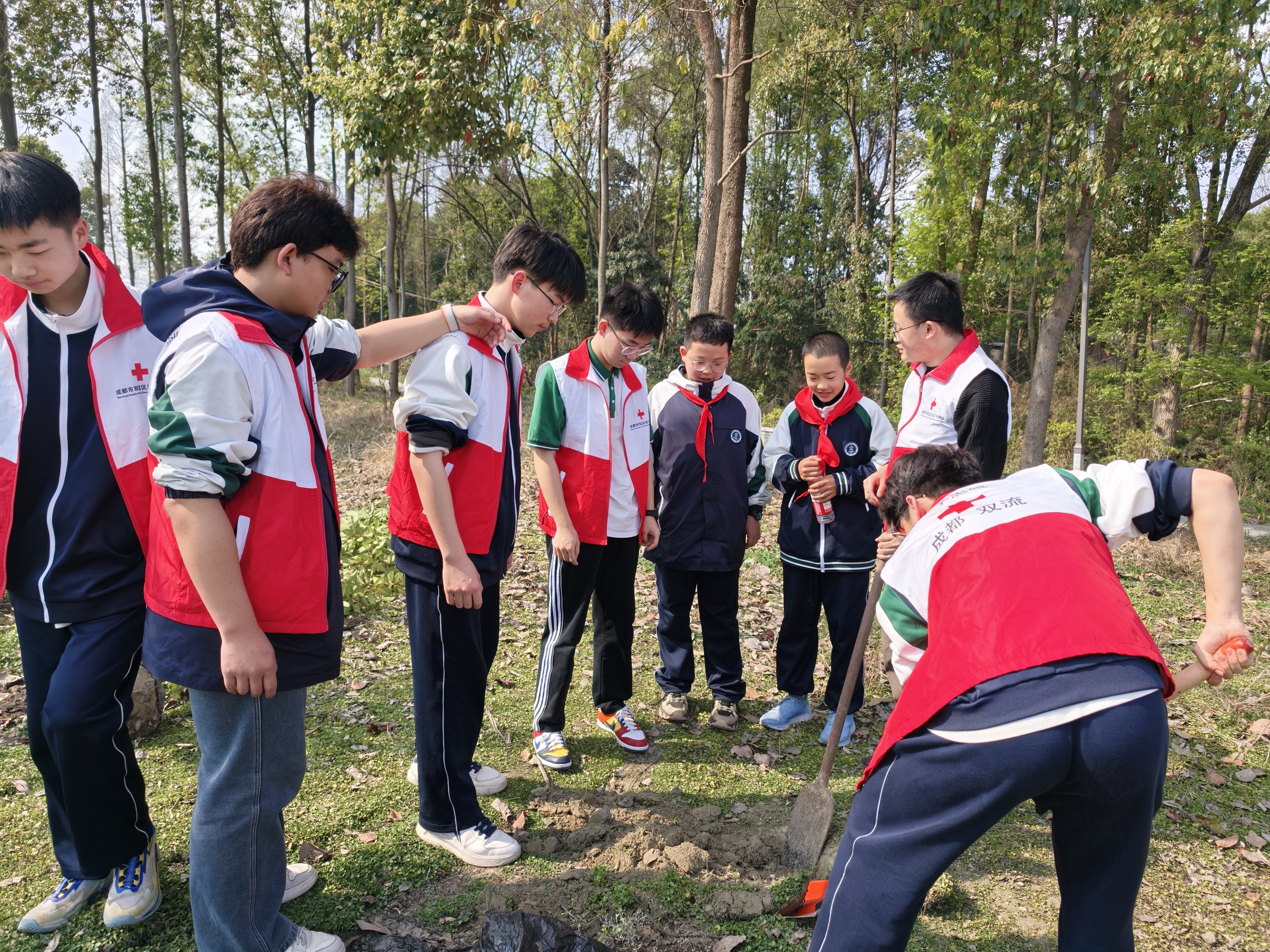 活动当天,阳光正好,微风不燥。在彭镇,老师们提前准备好了树苗、铁锹、水桶等工具,同学们怀着激动的心情,有序列队、分组集合,认真聆听老师讲解植树的方法和注意事项——挖坑、放苗、填土、踩实、浇水,每一个步骤都有讲究,每一个细节都不能马虎。
