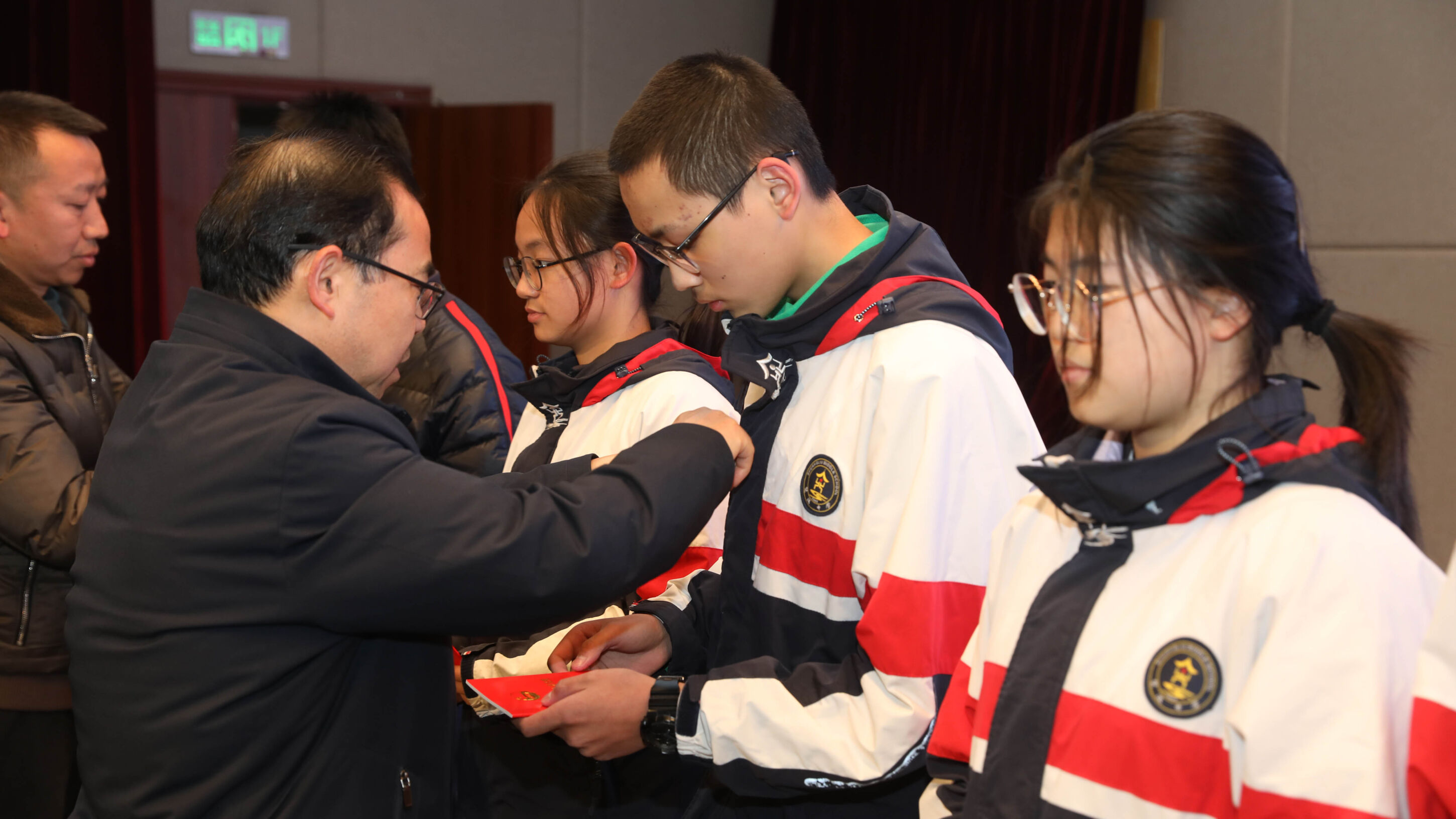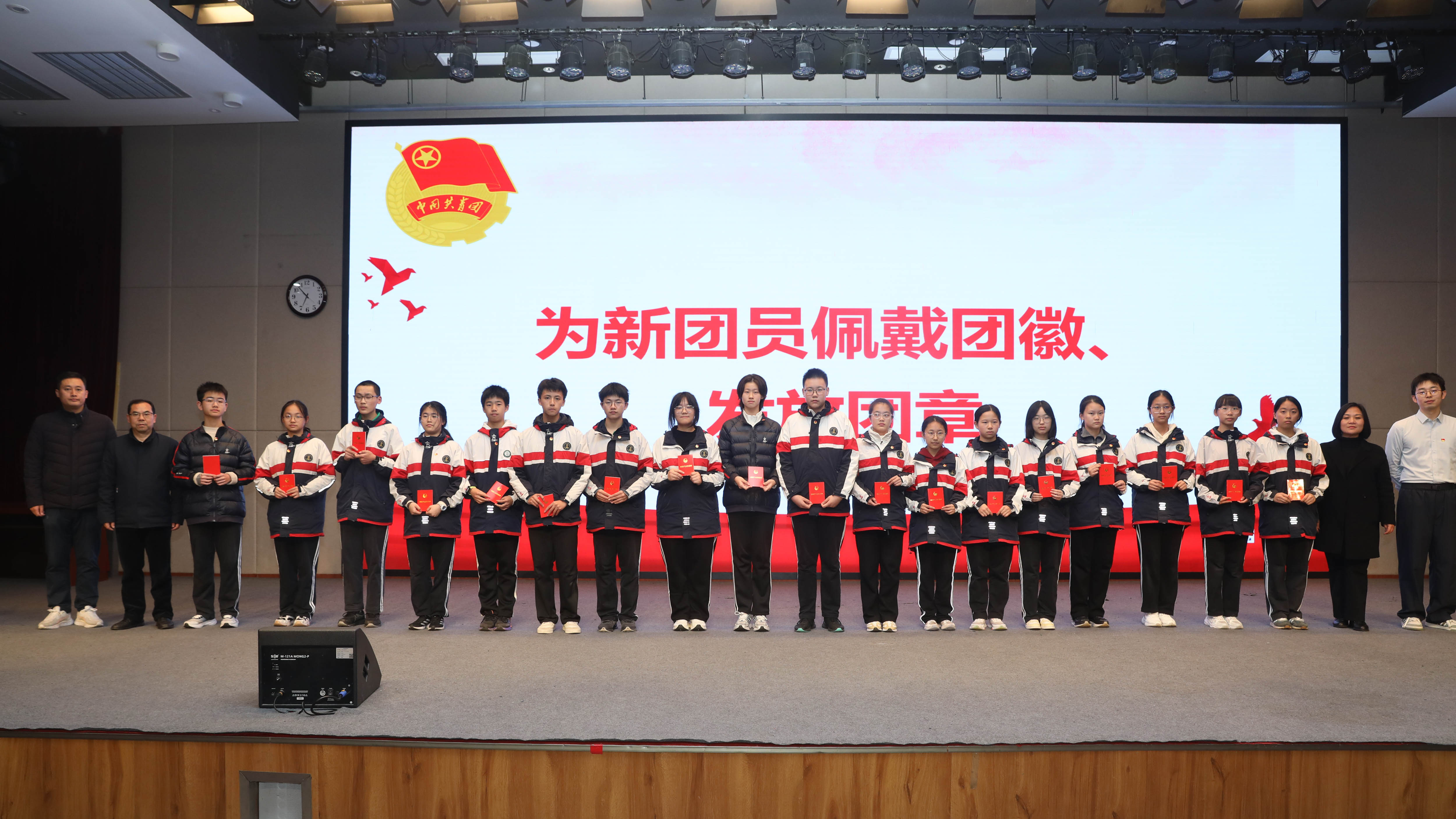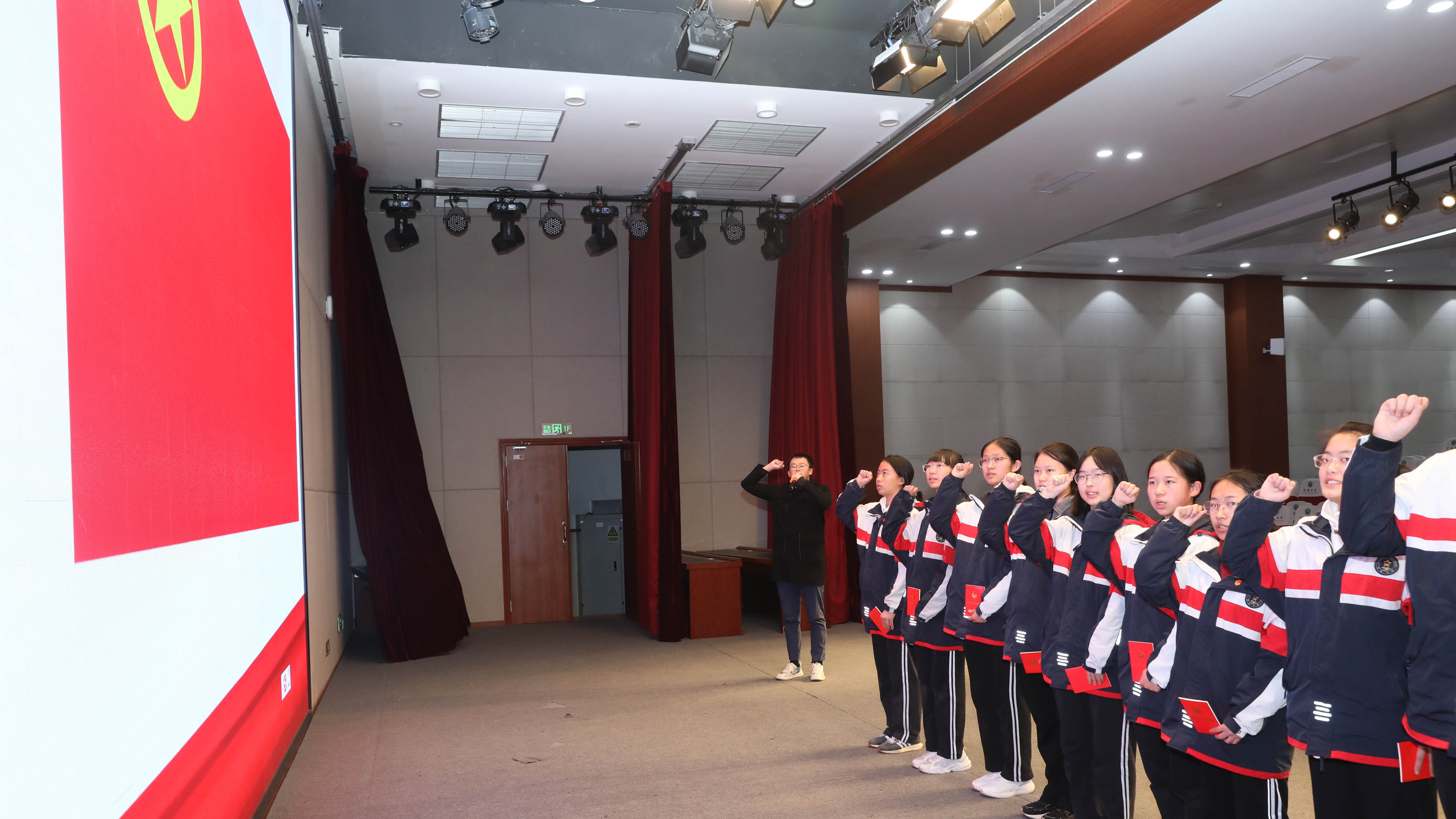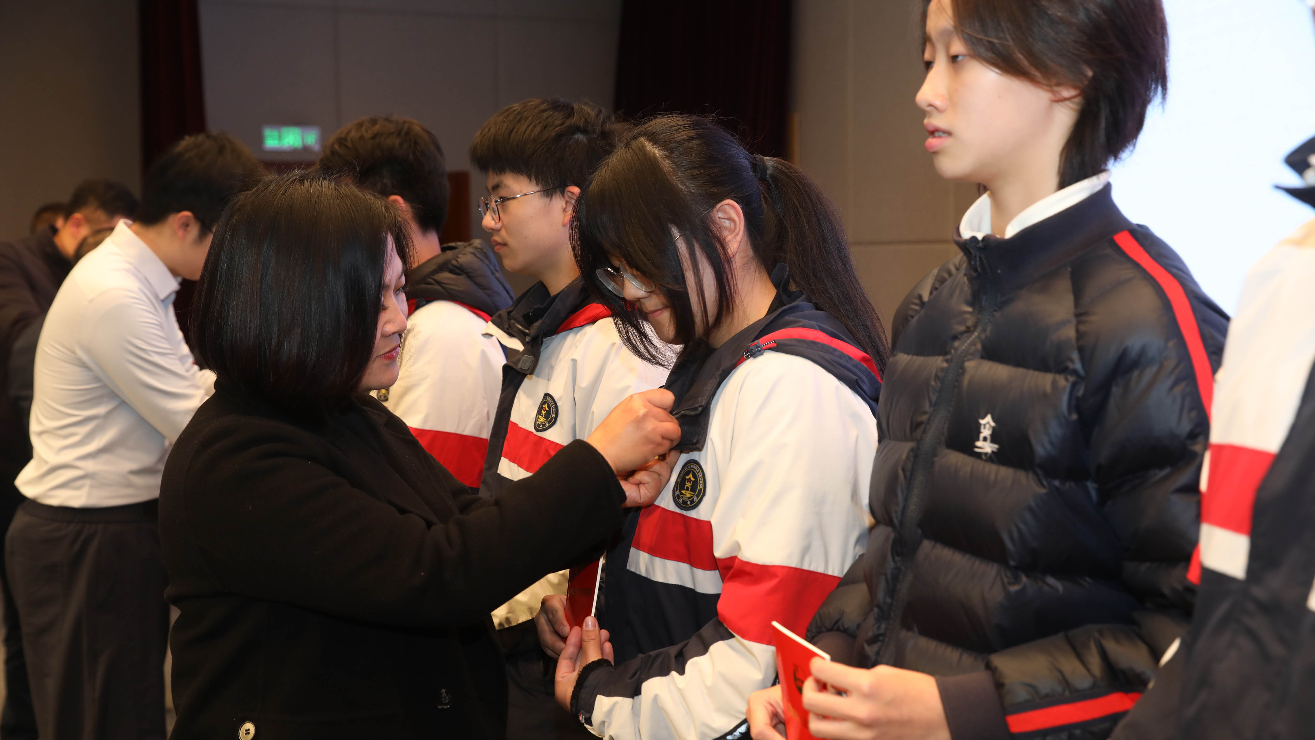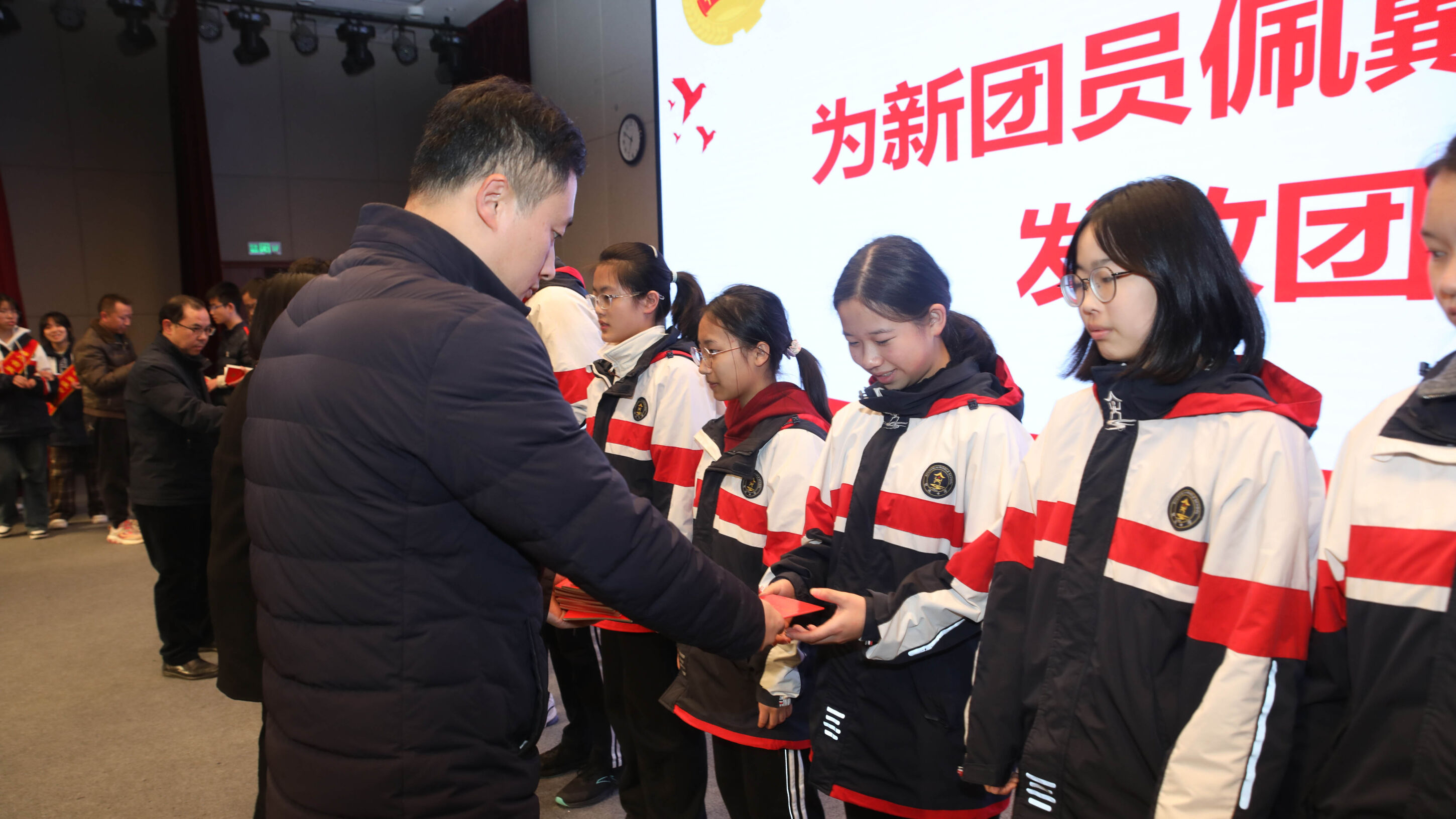图5 宣读新发展团员名单出席入团仪式的老师们手持闪耀的团徽,郑重地为新团员代表们佩戴在胸前,又将崭新的团章递到他们手中。熠熠生辉的团徽佩戴在胸前,不仅是一份沉甸甸的荣誉,更是一份“请党放心,强国有我”的无声承诺。团徽在胸,团章在手,标志着同学们的新起点,激励着他们时刻以团员标准严格要求自己。