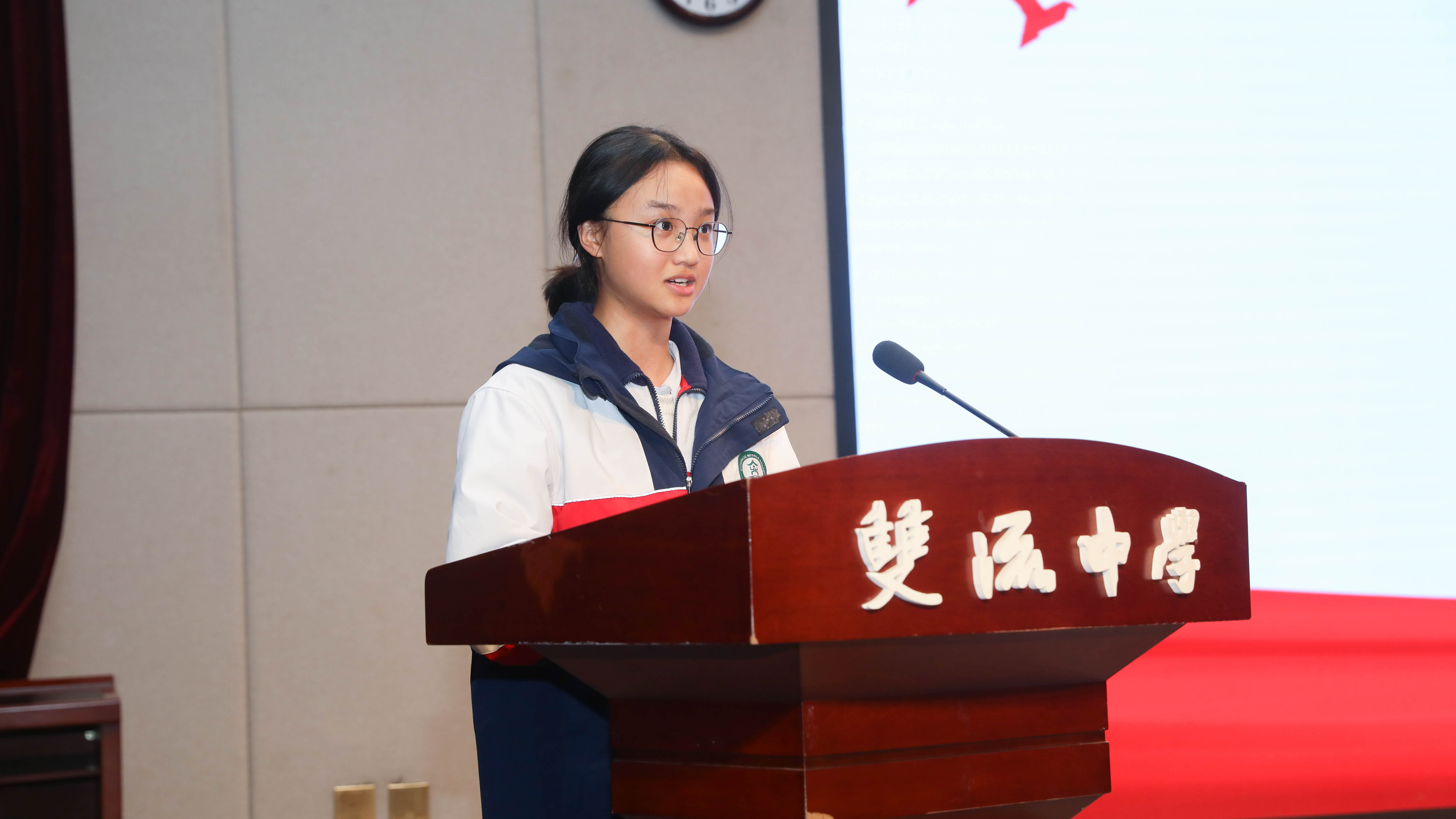 图13 老团员代表发言学校党委委员、副校长张巧菊为全体师生讲授了一堂深刻而富有感染力的主题团课。张校长首先回顾了“一二·九”运动的伟大历程,生动描绘了在民族危亡之际,广大爱国青年学生如何以血肉之躯掀起全国抗日救亡运动新高潮的历史画卷;接着将历史与校史紧密相连,指出双流中学诞生于抗日战争的烽火硝烟之中,自创立之初,爱国主义便成为根植于血脉的红色基因与精神底色。